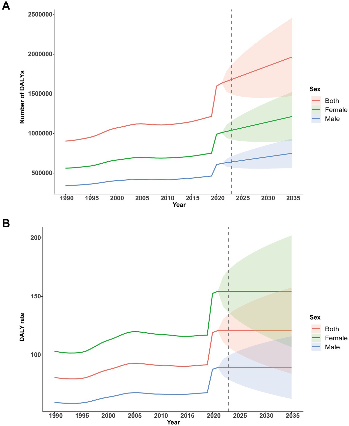 Figure 8. Forecasting the burden of DALYs up to 2035 using the ARIMA model. (A) Number of DALYs. (B) DALY rate. DALYs, disability-adjusted life-years.