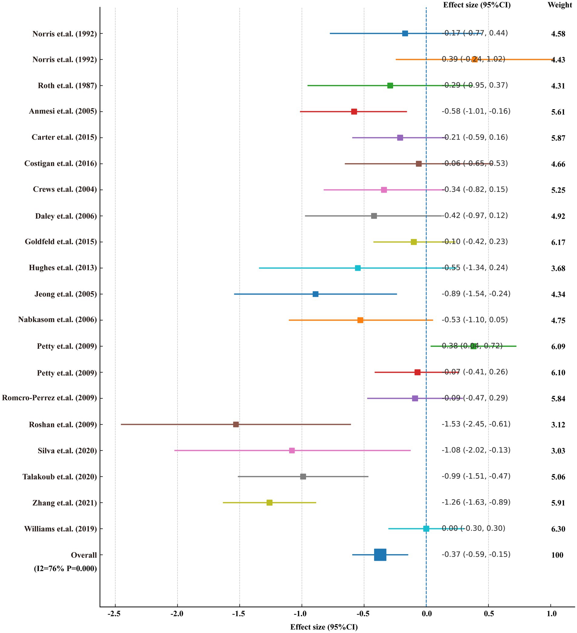 The meta-analysis demonstrated that PA was associated with a significant reduction in depressive symptoms among children and adolescents (standardized mean difference −0.37, 95% CI −0.59 to −0.15; I2 = 76%; p < 0.001) (Figure 9).