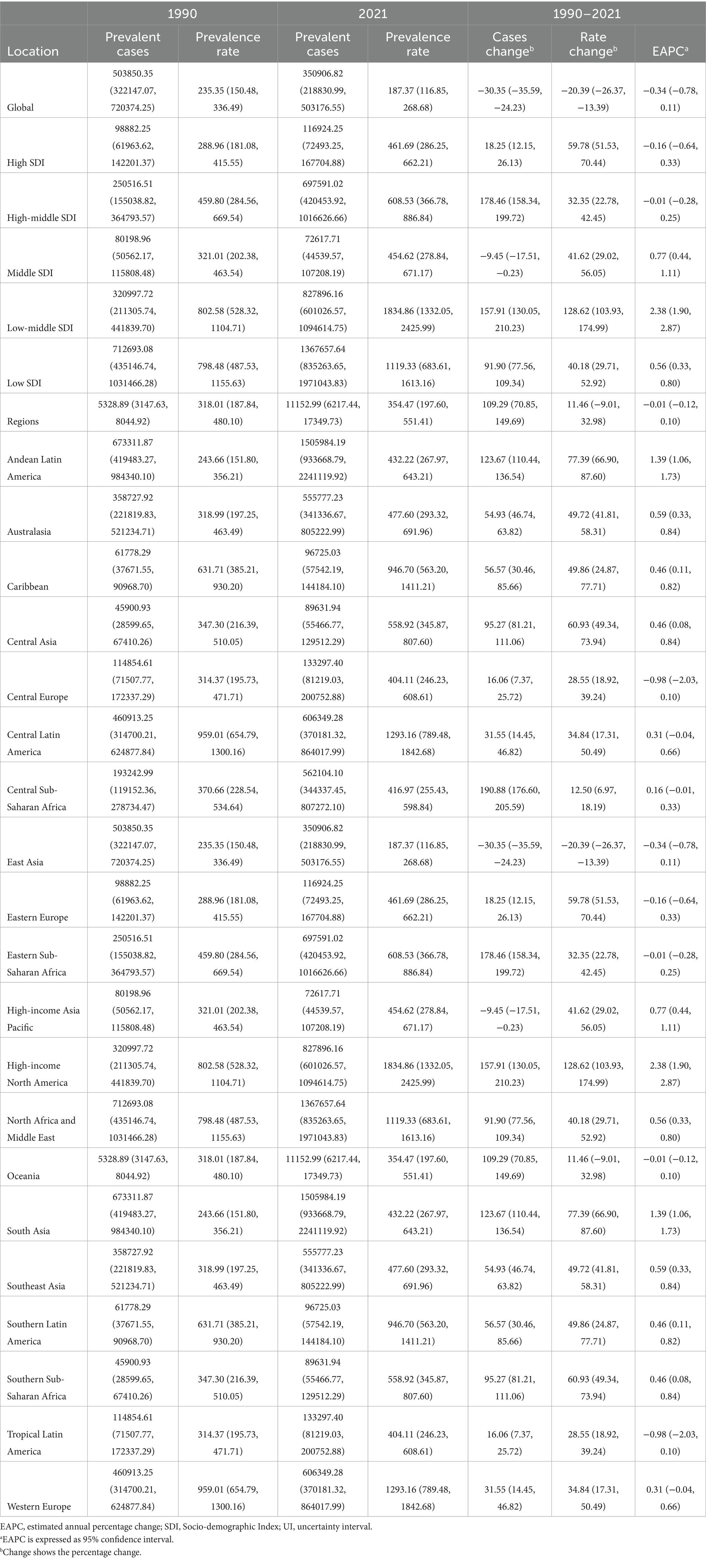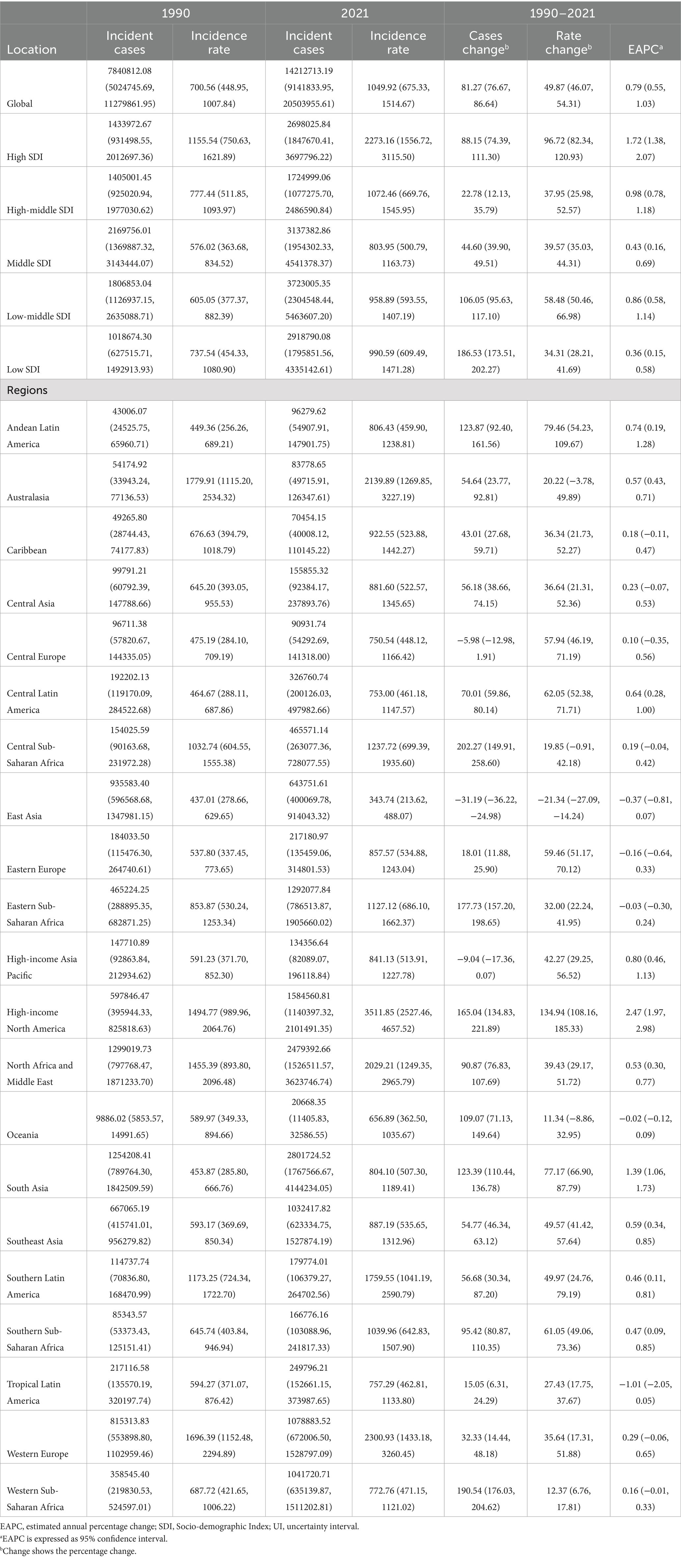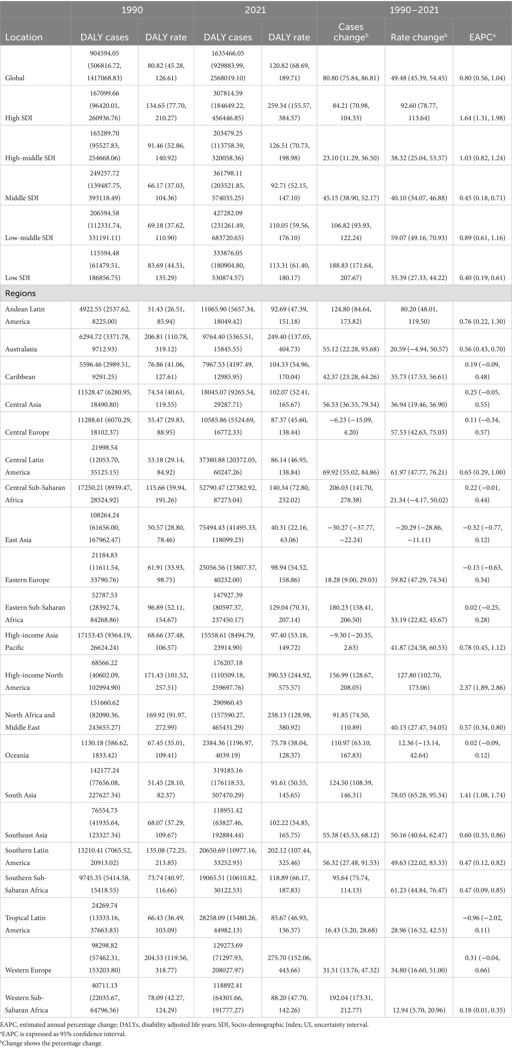 In 2021, the largest number of prevalent cases occurred in low-middle SDI regions (2,013,364, 95% UI, 1,226,768–2,963,052), but prevalence rate was highest in high SDI regions (1217.42 per 100,000, 95% UI, 840.64–1670.12; EAPC = 1.65, 95% CI, 1.31–1.99%; Table 1). Similarly, the highest number of incident cases was observed in low-middle SDI regions (3,723,005, 95% UI, 2,304,548–5,463,607), while the incidence rate and EAPC were greatest in high SDI regions (2273.16 per 100,000, EAPC = 1.72, 95% CI, 1.38–2.07%; Table 2). DALYs mirrored these patterns: low-middle SDI regions had the greatest number of DALYs (427,282, 95% UI, 231,261–683,721), but high SDI regions had the highest DALY rate (259.34 per 100,000, 95% UI, 155.57–384.57; EAPC = 1.64, 95% CI, 1.31–1.98%; Table 3).