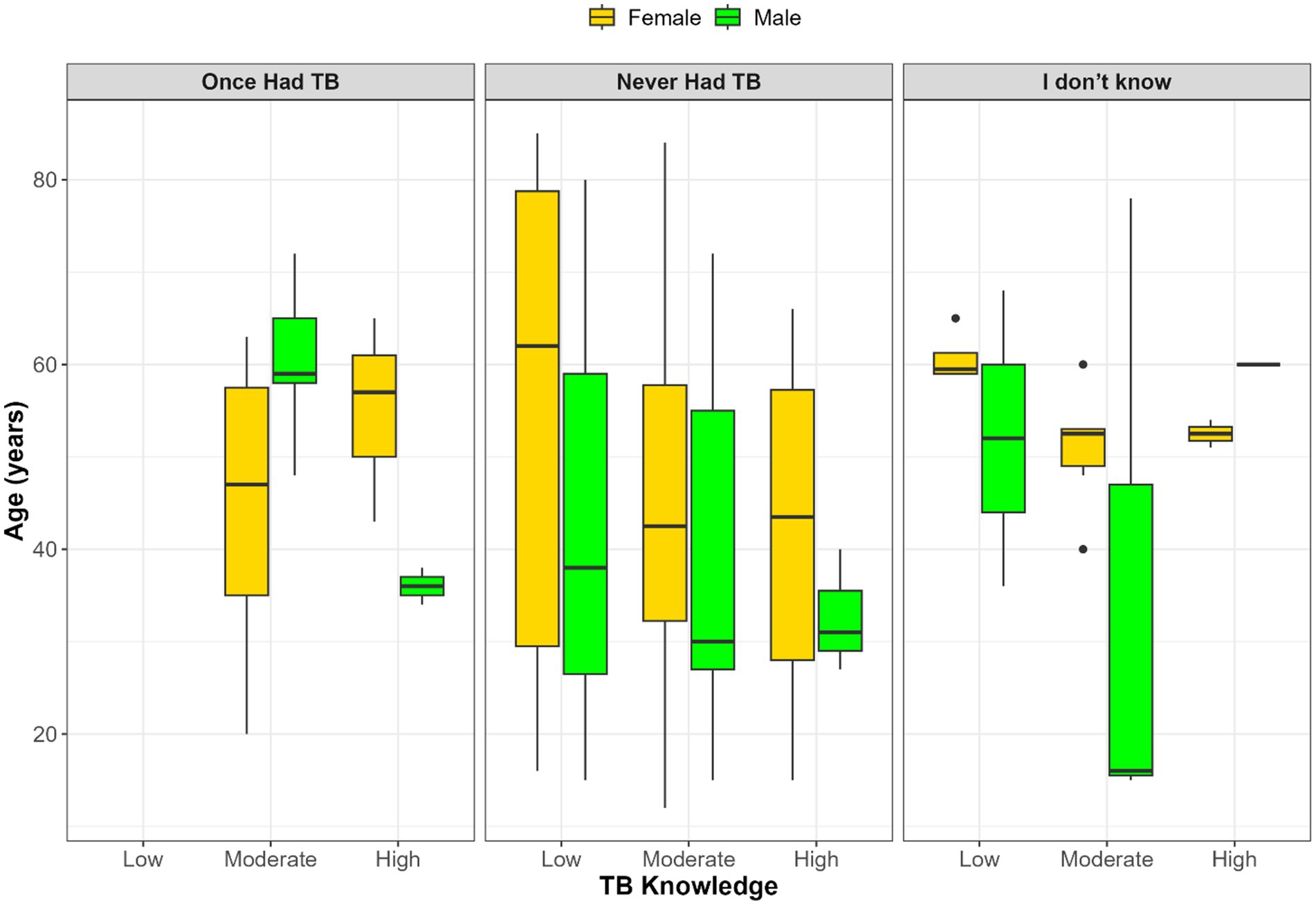 Figure 1 illustrates the intersection between TB knowledge, age, gender, and self-reported TB history. Among participants who had previously had TB, only moderate and high knowledge levels were observed, with older females more prevalent in the moderate group and younger males more common in the high knowledge category. In contrast, those who had never had TB exhibited a broader age distribution, but high TB knowledge remained more frequent among younger males. Participants uncertain of their TB history showed wide variability in age and inconsistent knowledge levels, with minimal representation in the high knowledge group. Overall, high TB knowledge was more commonly observed among younger participants, particularly males, while females were generally older across all knowledge categories.