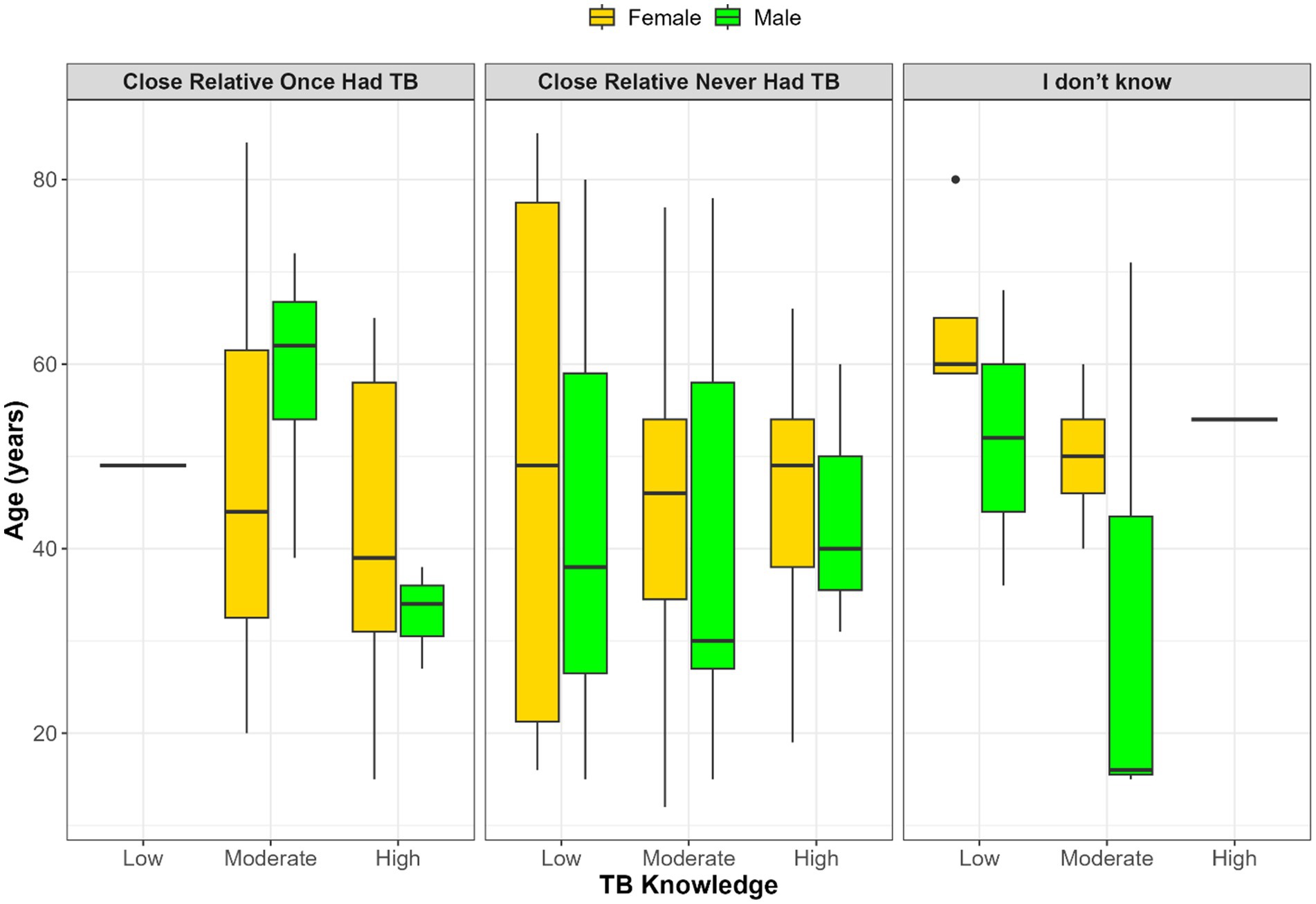 Figure 2. Distribution of age and gender across TB knowledge levels (low, moderate, high) stratified by participants’ knowledge of whether a close relative once had TB.