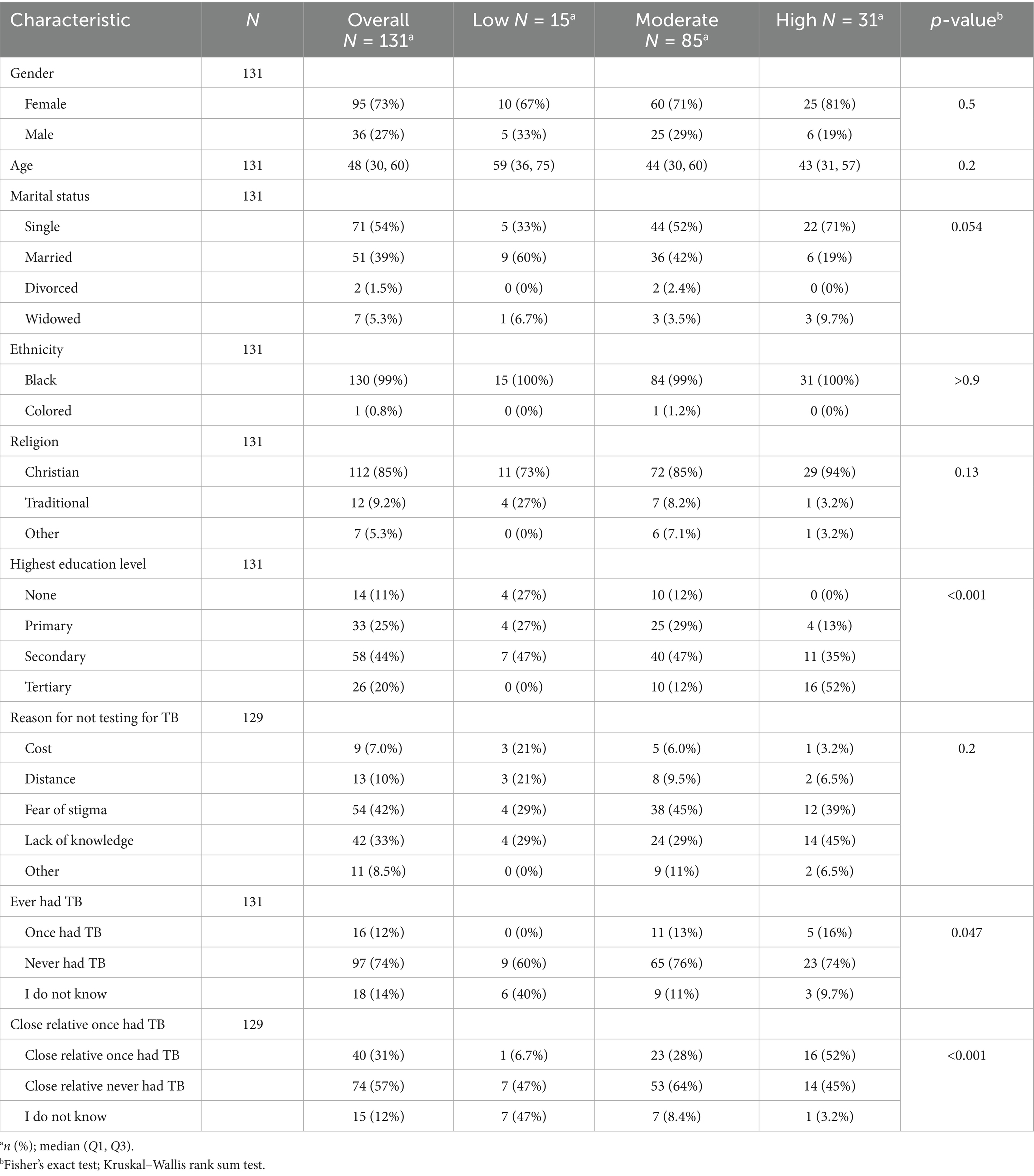 Out of 131 community members surveyed (Table 1), TB knowledge was categorized as low (11.5%), moderate (64.9%), and high (23.7%). Gender did not significantly influence knowledge levels (p = 0.5), although women made up 73% of the sample and were slightly more represented in the high knowledge group (81%). The median age was 48 years, with no significant differences across knowledge levels (p = 0.2); however, the high knowledge group tended to be younger (median age 43) compared to the low knowledge group (median age 59). Marital status showed a borderline association with knowledge (p = 0.054), with single individuals more common in the high knowledge group (71%) than the married group (19%). Nearly all participants identified as Black African (99%) and the majority as Christian (85%), though religion was not significantly associated with knowledge levels (p = 0.13). Education level showed a strong and significant association with TB knowledge (p < 0.001); notably, 52% of participants with high knowledge had a tertiary education, while none in the low knowledge group had reached this level. Those without formal education were disproportionately represented in the low knowledge group (27%), underscoring the impact of educational attainment on TB awareness. Among the 129 respondents who reported reasons for not testing for TB, the most cited barriers were fear of stigma (42%) and lack of knowledge (33%). Structural factors such as distance to clinics (10%) and cost (7%) were also mentioned. Although these barriers were not significantly associated with knowledge levels (p = 0.2), participants with low TB knowledge were more likely to report cost and distance as barriers (both at 21%). TB experience and contact history were found to influence knowledge levels among participants. Overall, only 12% reported having previously had TB, with none in the low knowledge group having personal experience, compared to 16% in the high knowledge group—a statistically significant difference (p = 0.047). Additionally, having a close relative who had TB was strongly associated with higher knowledge (p < 0.001); 52% of participants in the high knowledge group reported a family history of TB, in contrast to just 6.7% in the low knowledge group.