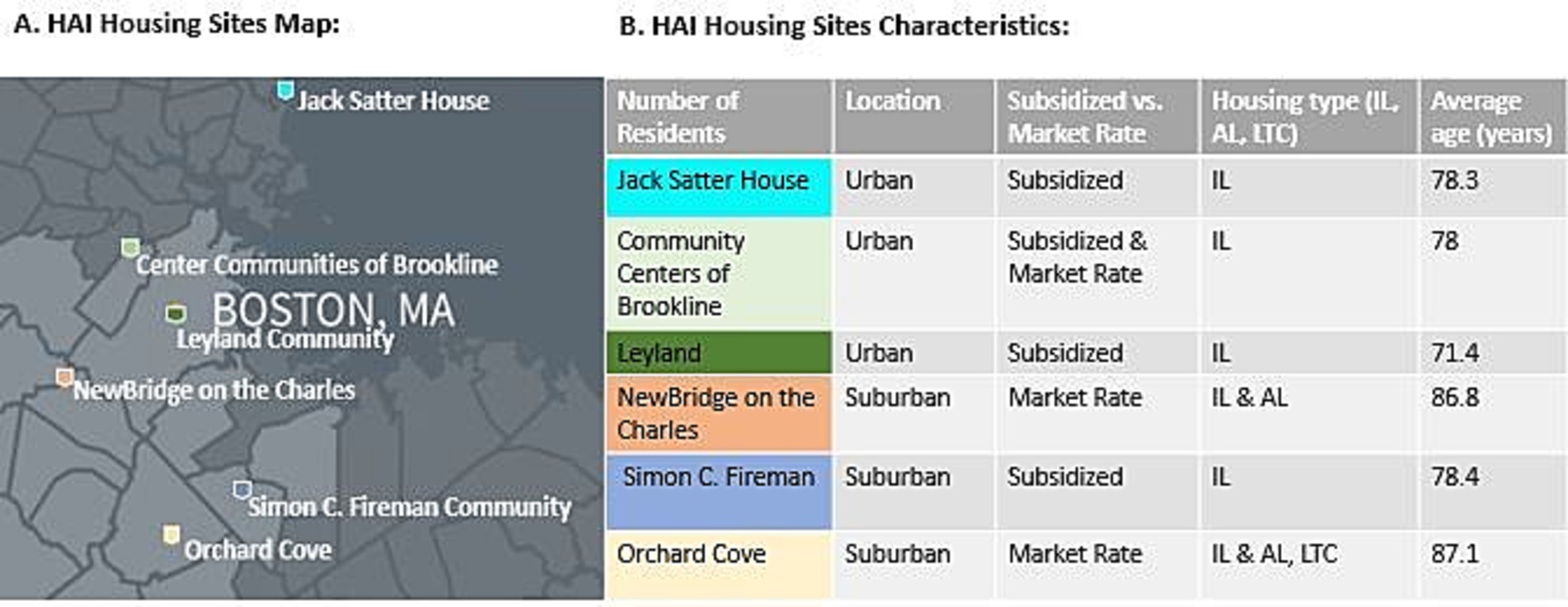 Figure 1. Overview of HAI study housing sites and characteristics. (A) Map of six housing site locations across the Greater Boston area: Jack Satter House (Satter) in Revere, Community Centers of Brookline (CCB) in Brookline, Leyland Community (Leyland) in Dorchester, NewBridge on the Charles (NBOC) in Dedham, Orchard Cove (OC) in Canton, and Simon C. Fireman Community (Fireman) in Randolph. (B) IL, independent living; AL, assisted living; LTC, long term care.