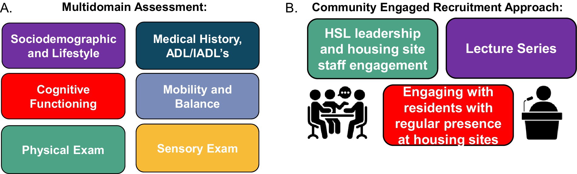 Diagram with two sections: A. Multidomain Assessment includes Sociodemographic and Lifestyle, Medical History, Cognitive Functioning, Mobility and Balance, Physical Exam, and Sensory Exam. B. Community Engaged Recruitment Approach includes HSL leadership engagement, Lecture Series, and Engaging with residents at housing sites, depicted with icons representing meetings and speeches.
