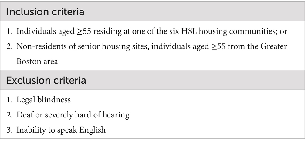 Participants are either (1) residents aged 55 and older from one of the six living communities within HSL, or (2) residents aged 55 and older living in separate single-family homes, representing the non-HSL community and serving as the control group (Table 1). This control group will comprise community-dwelling individuals from the Greater Boston area with the potential to understand differences in aging trajectories among senior housing or separate community dwelling older adults. We plan to recruit community-dwelling older adults through open community events. Through an anticipated large cohort, we aim to retrospectively match community-dwelling participants to senior housing residents based on age, sex, education, socioeconomic status, and health characteristics, while accounting for factors that may influence housing decisions such as family or partner support, functional status, and neighborhood environment. These variables will be considered during both the matching process and the interpretation of outcomes when comparing the two populations. We selected an age threshold of 55 and older because residents at HSL housing sites are eligible to move in at that age. Including participants aged 55 and older also allows for a longer observation period. Despite this lower inclusion threshold, most of our residents are over 65. For analytical purposes, we have the option to restrict the sample to a certain age range, when needed, to facilitate comparisons with other larger cohorts.