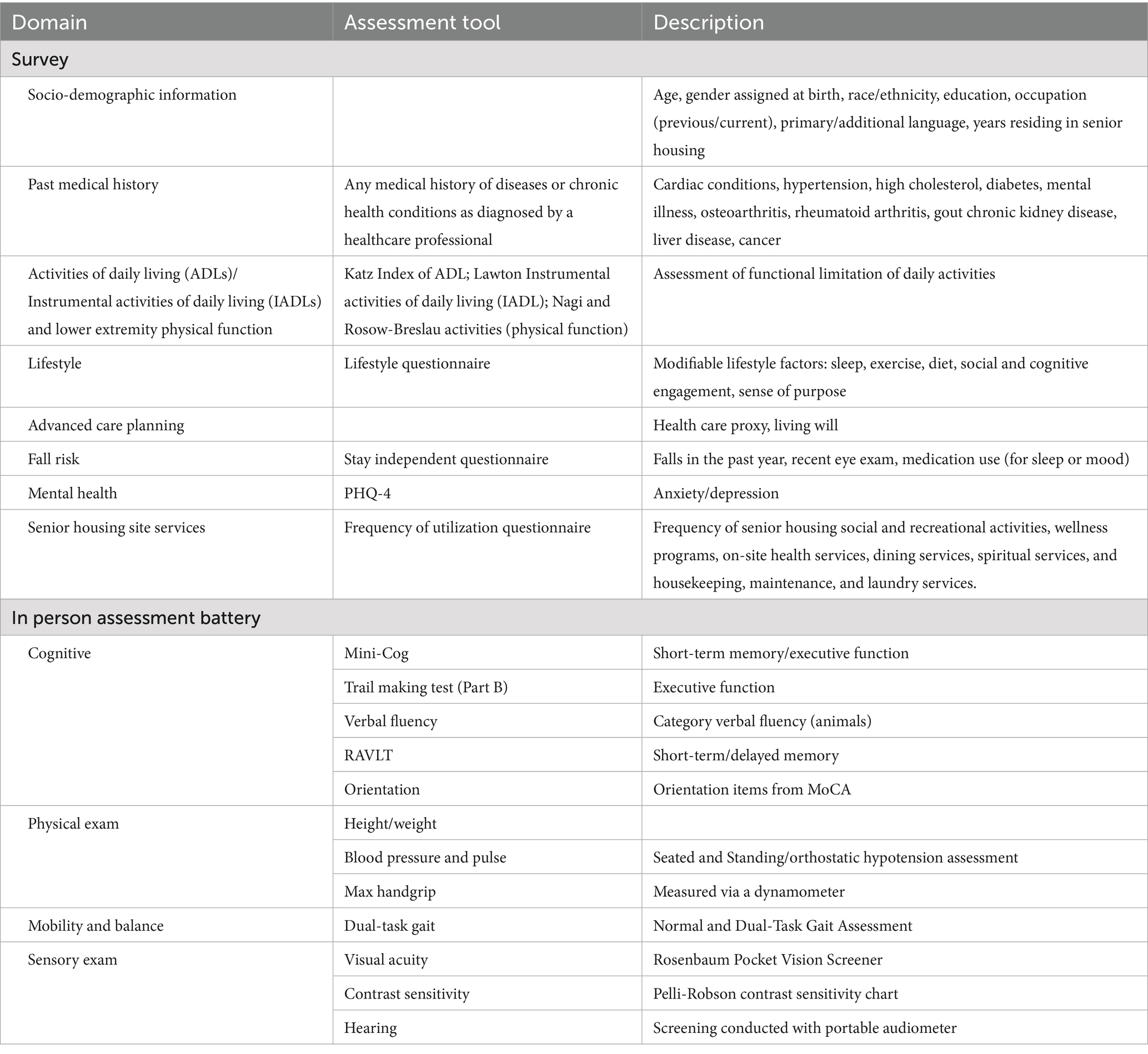Surveys are administered to participants either in person, over the phone with a research assistant, or via email for completion on their own computer at home (Table 2). The survey gathers information on sociodemographic information, including age, gender, sex, race/ethnicity, education, occupation, marital status, number of years residing in senior housing, as well as medical history, including medical and chronic conditions confirmed by a medical provider. To evaluate anxiety and depression, participants complete the Patient Health Questionnaire for Depression and Anxiety (PHQ-4), a brief, validated four-item tool (10). Next, participants are asked about their abilities in activities of daily living (ADL), which includes essential skills for meeting basic physical needs, such as bathing, toileting, dressing, eating, moving, transferring (11). They are also asked about instrumental activities of daily living (IADLs), which encompass skills required to live independently, such as meals preparation, financial management, housekeeping, and shopping (12) and lower extremity mobility in respect to walking and stair climbing (13). The survey features a lifestyle questionnaire, which is a shortened 35-item assessment designed to evaluate modifiable risk factors in aging research (14, 15). This lifestyle questionnaire was developed as part of the Barcelona Brain Health Initiative, a longitudinal cohort study assessing predictors of brain health (14, 15). It evaluates lifestyle domains such as cognitive stimulation and reserve, memory concerns, alcohol and tobacco use, familial history of longevity, hearing loss, medication use, diet, physical activity, loneliness, sleep, social engagement, sense of purpose, and life satisfaction (14, 15). In addition, the survey includes an abbreviated version of the validated Stay Independent Questionnaire to assess fall risk (16) and questions about advance care planning. The advanced care planning section asks whether participants have (1) designated a health care proxy and (2) completed a formal written document specifying desired treatments if they were to become seriously ill.