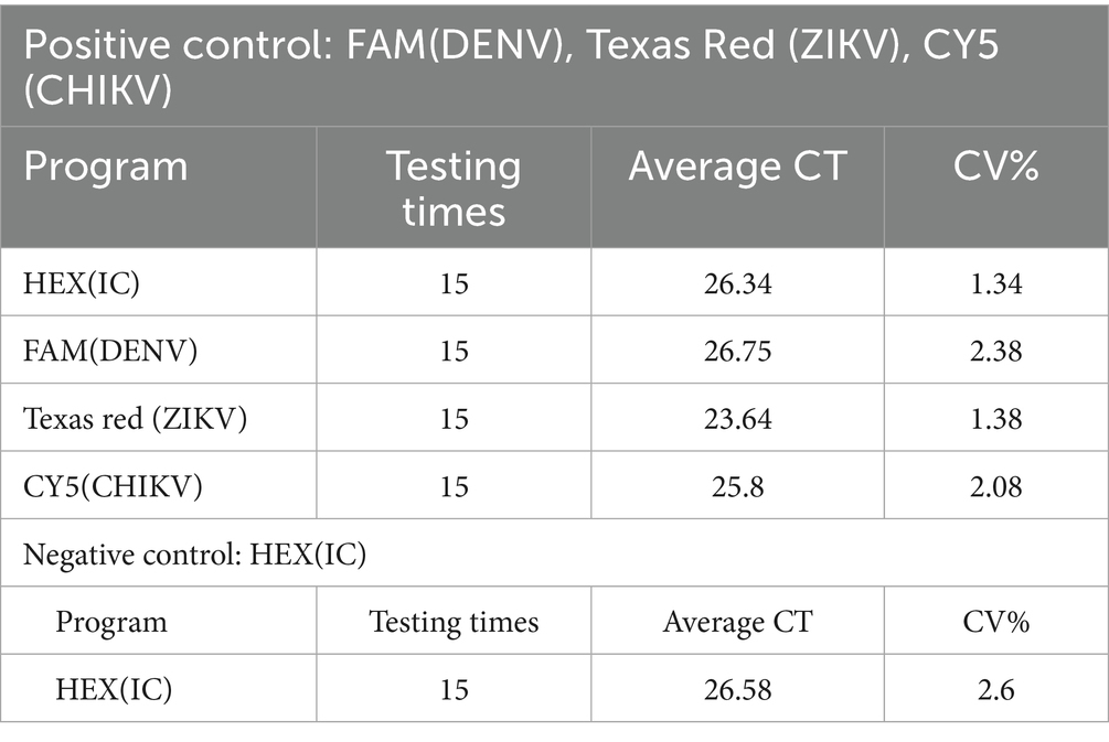 The 1,252 test kits were used in an 8-in-1 pool testing mode to detect 10,009 blood specimens from blood donors. Of the 10,009 specimens, 7,520 were from blood donors in the urban areas of Shenzhen (collected by the Shenzhen Blood Center), and 2,489 were from blood donors in the suburban areas of Shenzhen (collected by the Bao’an Blood Center). The 1,252 pooled testing results were all negative, indicating that the prevalence of DENV, ZIKV, or CHIKV were extremely low in these 10,009 blood donor specimens. (Table 2).