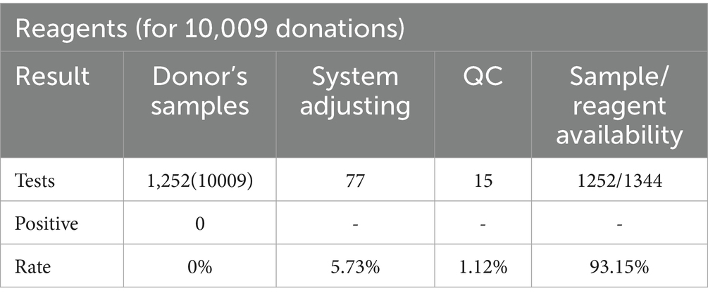 Table 2. Screening results and reagent availability of nucleic acid detection of dengue, Zika and chikungunya viruses in 10,009 blood donations.