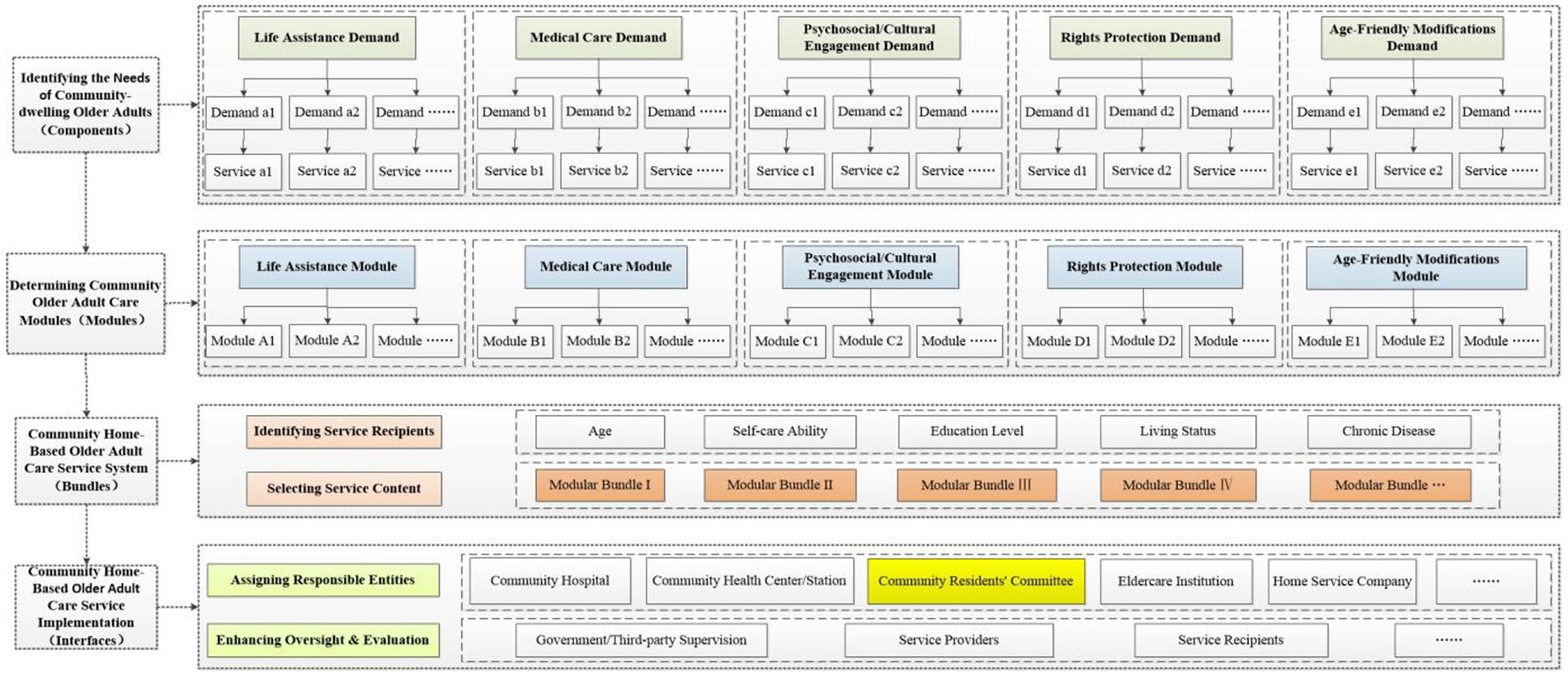 Communities, as social entities within defined geographical boundaries, exhibit significant heterogeneity and complexity due to variations in demographic composition, regional planning, and economic development. Modular design principles offer distinct advantages in decomposing complex tasks into relatively simple functional units. Their organizational and technical flexibility enables effective adaptation to inter-community variations and complexities, thereby constituting a viable design framework for contemporary community home-based older adult care services and and building a more sustainable ecosystem for both care recipients and caregivers.