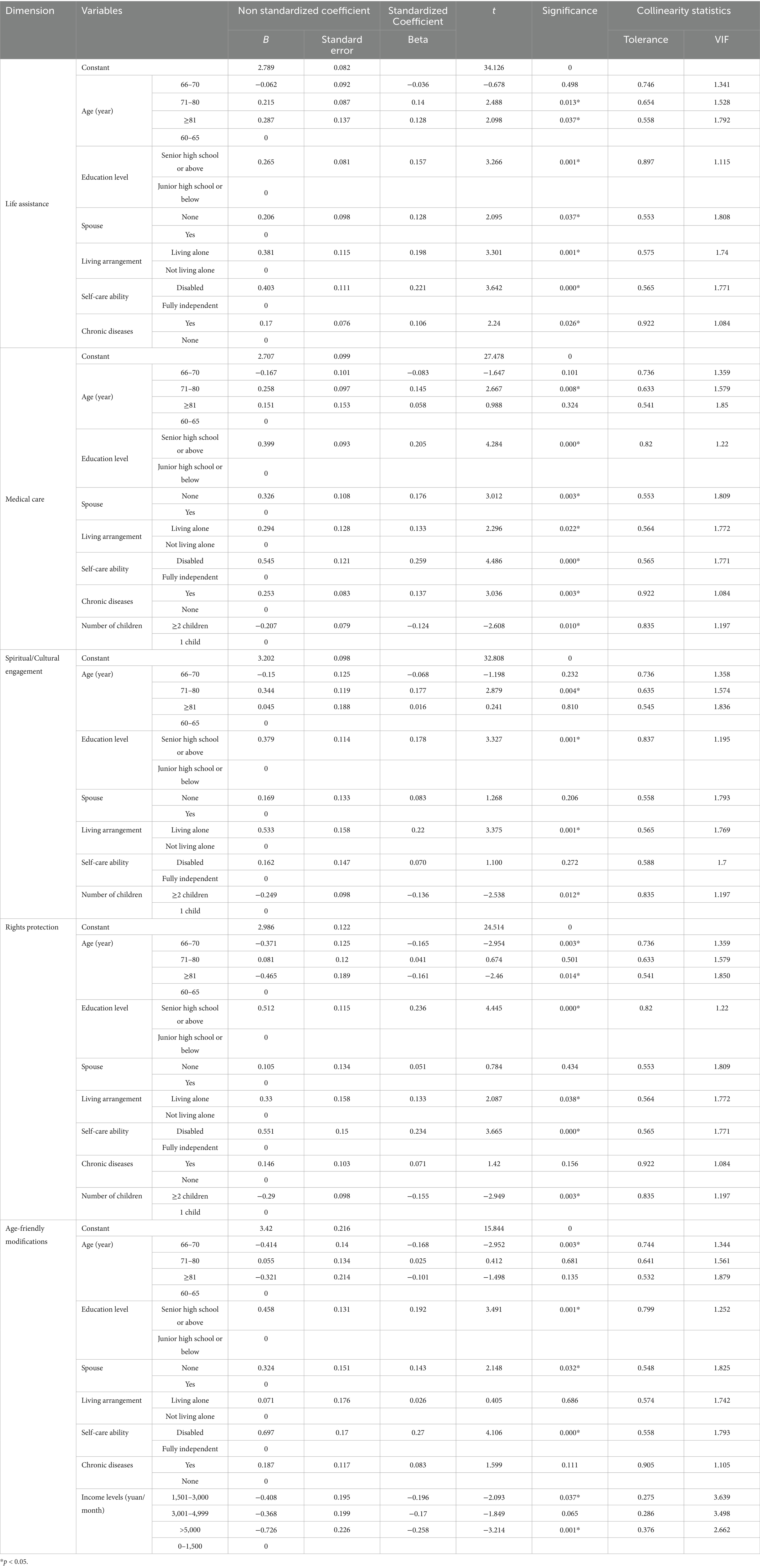 To identify independent factors influencing demand, multiple linear regression analyses were performed for each of the five demand dimensions. The results are presented in Table 3. The assumptions of linear regression were verified prior to analysis (as detailed in Section 2.1.2). Variables such as advanced age, disability, living alone, and higher education level were significant predictors of higher demand across multiple service modules. ① Life assistance: Regression analysis identified age, education level, spouse, living arrangement, self-care ability, and chronic disease as independent significant factors influencing demand for life assistance (all p < 0.05). Specifically: Demand was significantly higher among older adults aged 71–80 (B = 0.215, p = 0.013) and ≥81 years (B = 0.287, p = 0.037) compared to those aged 60–65. Individuals with a higher education levels exhibited greater demand (B = 0.265, p = 0.001). Demand was significantly higher among those without a spouse (B = 0.206, p = 0.037) and those living alone (B = 0.381, p = 0.001). Disabled older adults showed the most pronounced increase in demand (B = 0.403, p < 0.001). ② Medical care services: Demand for medical care services was significantly influenced by age, education level, spouse, living arrangement, self-care ability, chronic disease, and number of children (all p < 0.05). Individuals aged 71–80 years reported higher demand (B = 0.258, p = 0.008), while the ≥81 years group showed no significant difference (p = 0.324) compared to 60–65 years. Those with a higher education levels placed greater emphasis on medical care (B = 0.399, p < 0.001). Individuals with ≥2 children exhibited lower demand (B = −0.207, p = 0.010). Demand was significantly higher among those with chronic diseases (B = 0.253, p = 0.003) and disabled (B = 0.545, p < 0.001). ③ Spiritual/cultural engagement: Age, education level, living arrangement, and number of children significantly impacted demand for spiritual/cultural engagement. Demand was higher in the 71–80 years group (B = 0.344, p = 0.004). Individuals with a higher education levels (B = 0.379, p = 0.001) and those living alone (B = 0.533, p = 0.001) reported significantly greater demand. Individuals with ≥2 children exhibited lower demand (B = −0.249, p = 0.012). ④ Rights protection: Education level, self-care ability, and number of children were the primary factors influencing demand for rights protection. Individuals with a a higher education levels demonstrated greater concern for rights protection (B = 0.512, p < 0.001). Disabled older adults showed higher demand for rights protection (B = 0.551, p < 0.001). ⑤ Age-friendly modifications: Low-income and disabled groups exhibited the most urgent need for age-friendly modifications. Individuals with an income >5,000 yuan reported significantly lower demand (B = −0.726, p = 0.001), while the low-income group (0–1,500 yuan) showed the highest demand, reflecting the constraints imposed by economic conditions on housing modifications. Disabled individuals exhibited the strongest demand intensity (B = 0.697, p < 0.001).