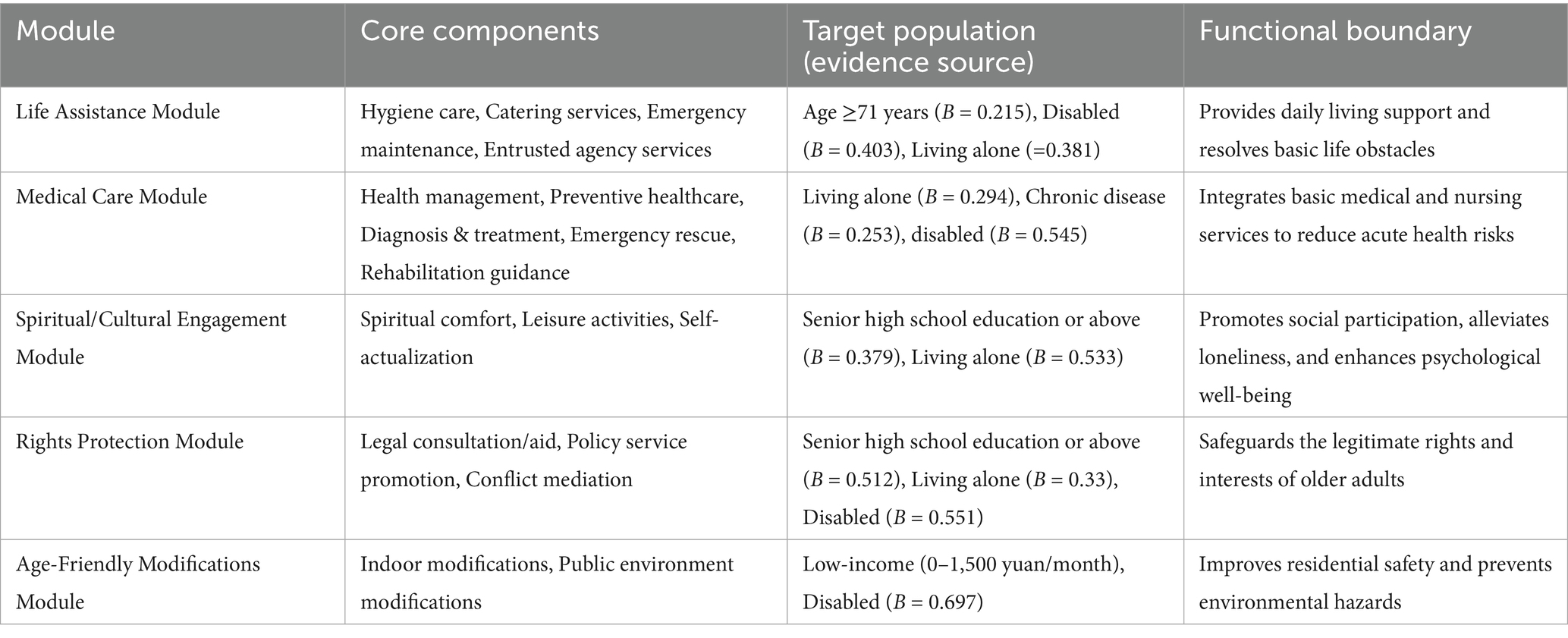 Our findings on the heterogeneity of older adults’ demands have direct implications for alleviating caregiver burden. The significantly higher service needs identified among subgroups such as the disabled, those living alone, and the advanced-aged underscore the intense pressure faced by their caregivers. For instance, the strong demand for life assistance and medical care among the disabled older adults (B = 0.403 and 0.545, respectively) aligns with existing literature (20) highlighting the elevated physical and psychological strain on caregivers supporting individuals with high dependency. The modular service model proposed in section 3 of this study directly addresses this issue by providing structured and standardized support bundles. By providing a clear framework for what services are needed and how they can be combined, the model acts as a decision-support tool, guiding caregivers and service providers toward more effective and comprehensive care plans. This structured approach not only mitigates the overwhelming uncertainty often experienced by family caregivers but also empowers them by enhancing the predictability and accessibility of resources, thereby contributing to a more sustainable care ecosystem.