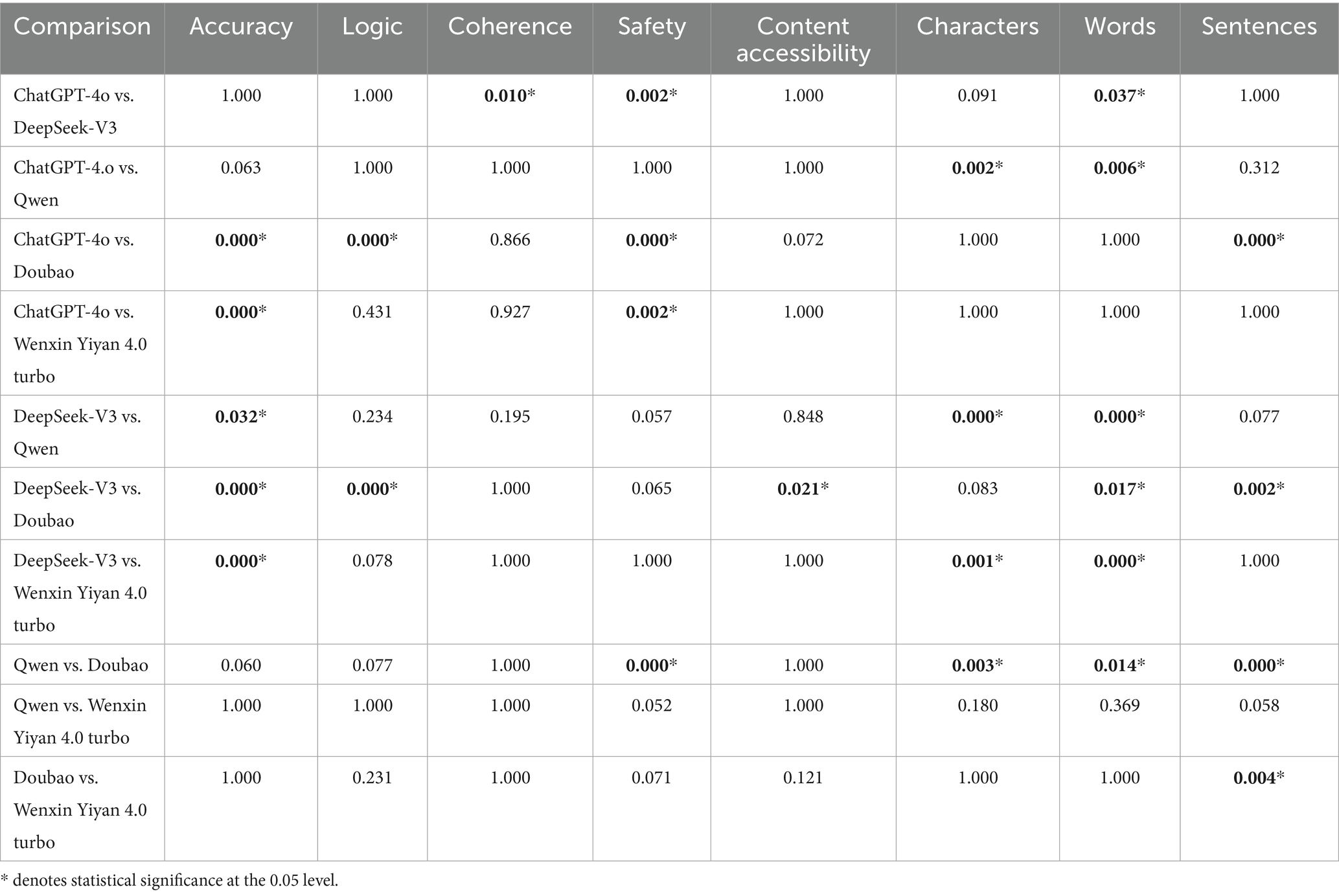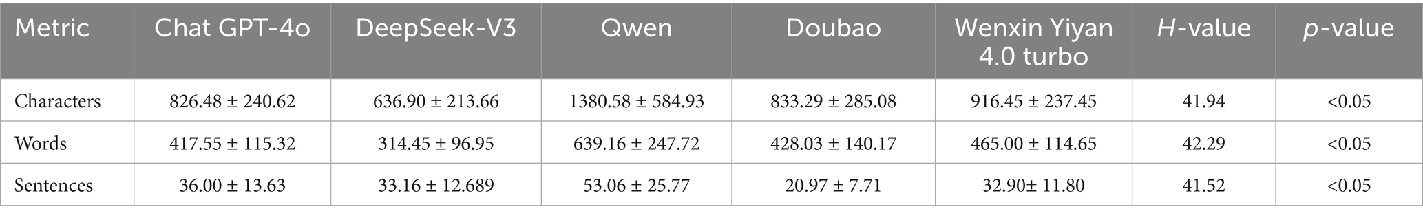 Table 3 and Figure 2 present descriptive statistics for character, word, and sentence counts. Qwen produced the longest responses (1,380.58), significantly exceeding ChatGPT-4o (826.48) and DeepSeek-V3 (636.90) (p < 0.05). Wenxin Yiyan 4.0 Turbo generated 916.45 words, approximating ChatGPT-4o. Similarly, Qwen yielded the highest token count (639.16), substantially surpassing DeepSeek-V3 (314.45) and ChatGPT-4o (417.55) (p < 0.05). Doubao and Wenxin Yiyan 4.0 Turbo produced fewer tokens (428.03 and 465.00, respectively). Qwen also generated the greatest number of sentences (53.06), significantly exceeding DeepSeek-V3 (33.16) and ChatGPT-4o (36.00) (p < 0.05). Conversely, Doubao and Wenxin Yiyan 4.0 Turbo produced the fewest sentences (20.97 and 32.90, respectively). Collectively, Qwen generated significantly more characters, words, and sentences than all other models (p < 0.05). Comprehensive pairwise comparisons are presented in Table 3 and Figure 2.