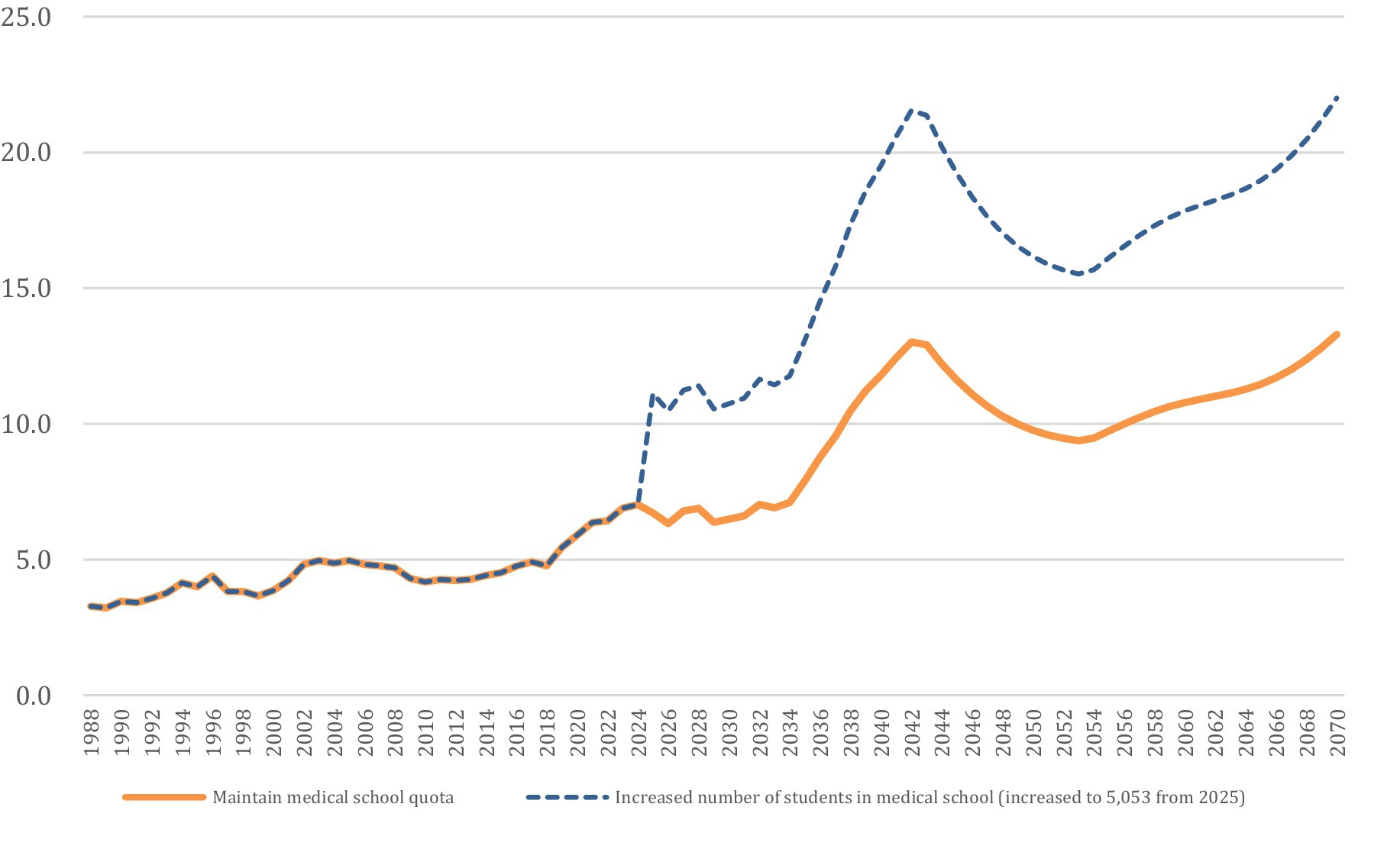 Figure 1. Estimated medical school quota ratio compared to the number of students expected to enter college (age 18). This figure utilizes KOSIS data on annual birth counts and projections for the 18-year-old population to estimate the number of prospective college entrants. The medical school quota data are based on government and media announcements, assuming an increase to 5,053 seats from 2025 onward. “Maintain medical school quota” reflects the status quo, while “Increased number of students in medical school (5,053 from 2025)” illustrates an expansion scenario.