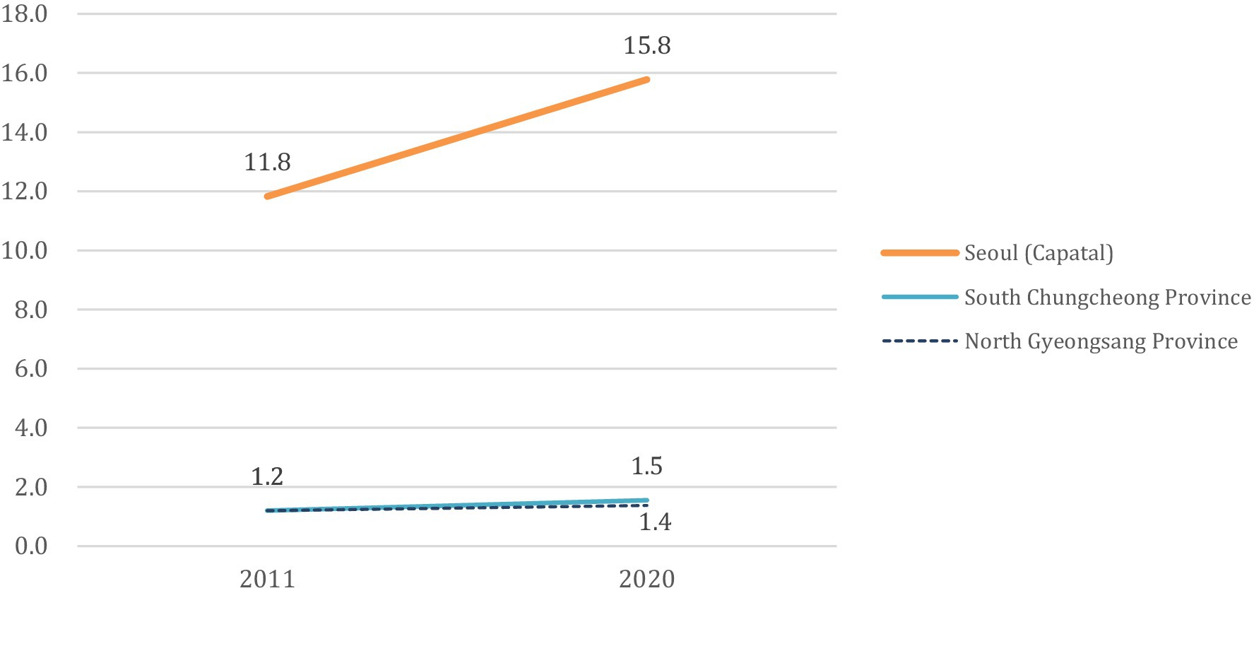 Figure 2. Differences in the ratio of doctors working at medical institutions by region per 1,000 population (weighted by medical use) between 2011 and 2020. This figure was generated by (1) extracting 2011 and 2020 population data for Seoul, South Chungcheong, and North Gyeongsang from KOSIS (Korean Statistical Information Service https://kosis.kr/index/index.do) by age group, and (2) deriving age-specific utilization weights (daily care utilization, per capita medical expenditure) from the HIRA Big Data Open System (Health Insurance Review & Assessment Service https://opendata.hira.or.kr/home.do). We then multiplied each age-group population by its respective weight to calculate a “weighted population” (∑(age-group population × utilization weight)) for each region. The number of practicing physicians in 2011 and 2020 was obtained from administrative statistics (e.g., Ministry of Health and Welfare, Korean Medical Association), and divided by the weighted population to yield physicians per 1,000 weighted persons. This approach accounts for age-specific healthcare utilization, thereby offering a more refined view of regional healthcare accessibility than a simple ratio of physicians to total population.