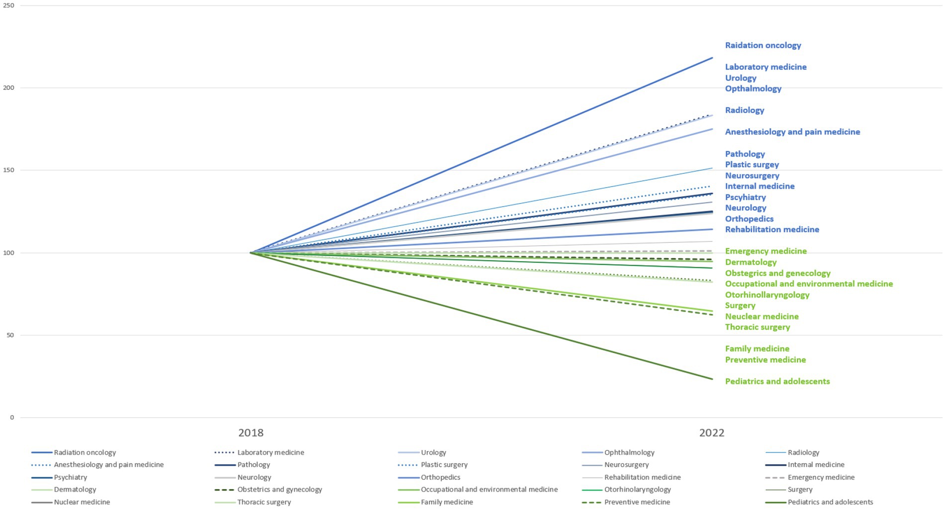 Figure 3. Change in total number of residency applicants by medical specialties between 2018 and 2022. Residency applicant data from 2018 to 2022 were compiled from publicly disclosed figures in major media outlets, which reported official announcements regarding specialty-specific application trends. This approach was used because no single consolidated dataset was available at the time.