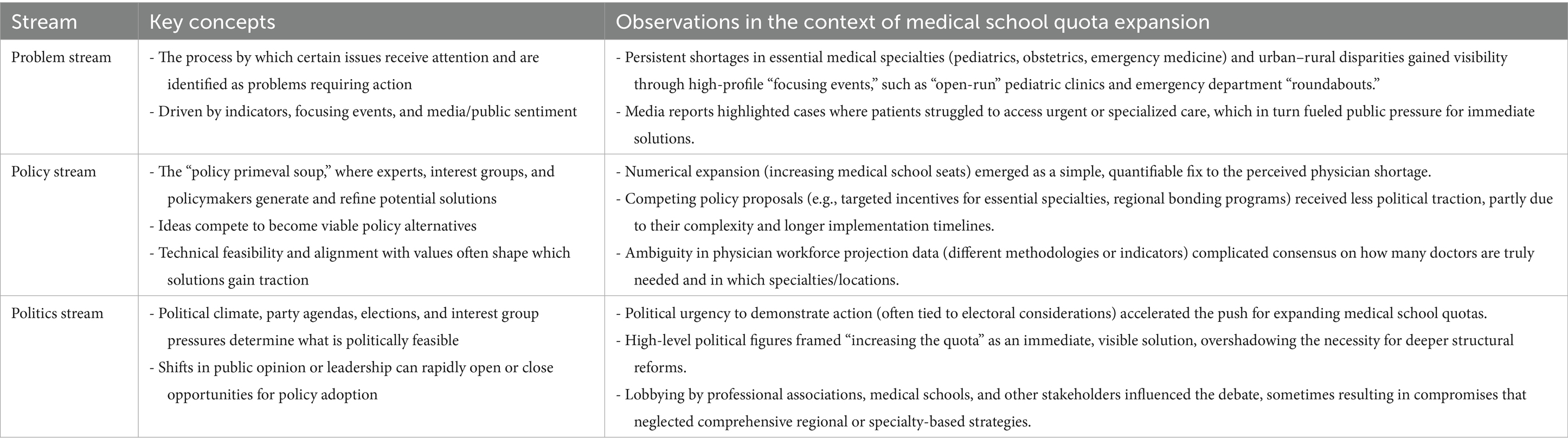 This stream-based approach made it possible to capture how political pressures shaped the choice of expanding medical school quotas as the preferred policy solution, while also highlighting the limited deliberation and stakeholder inclusion that accompanied the rapid policy shift.