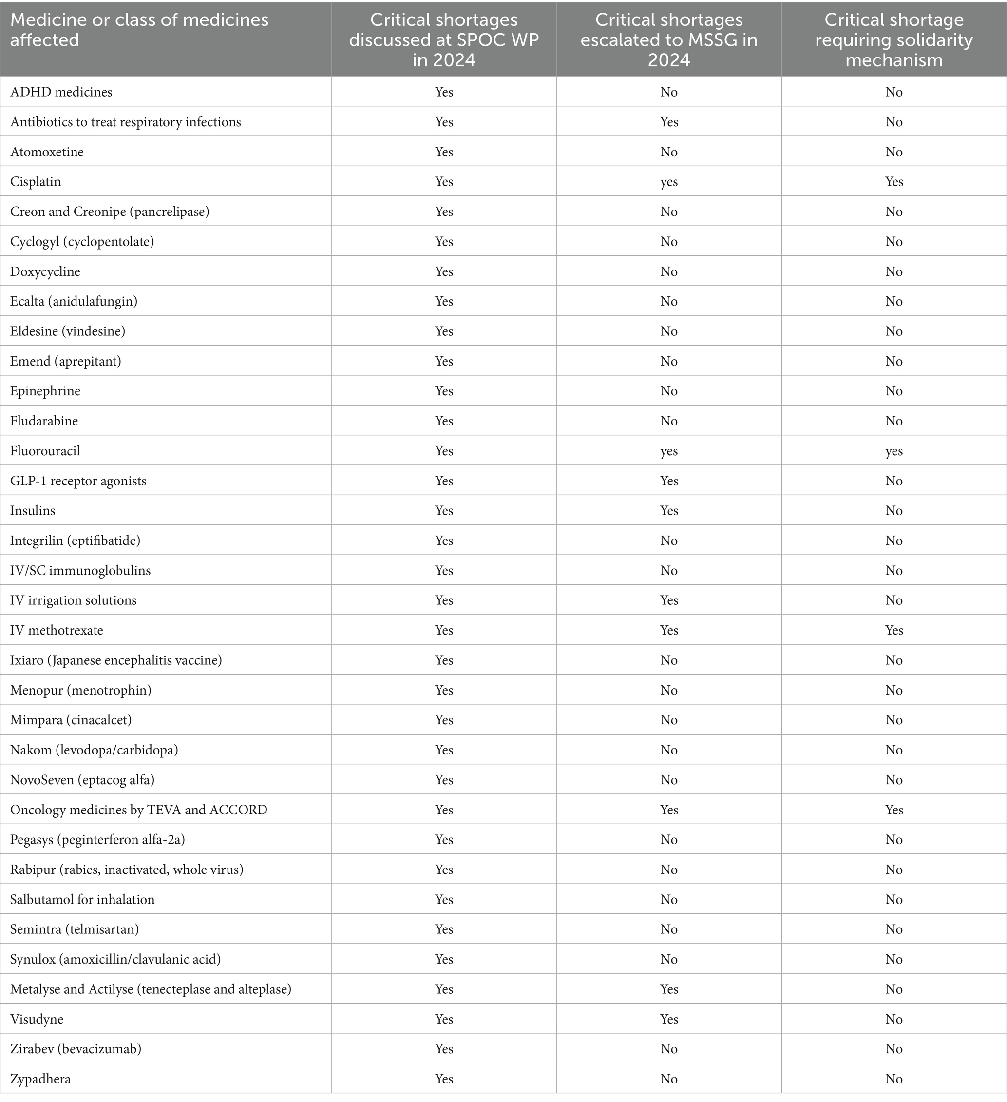 Table 1. Critical shortages monitored at SPOC WP, escalated to MSSG and subject to solidarity mechanism in 2024.