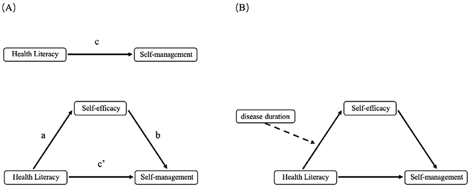 Therefore, this study aims to address two key research questions through a moderated mediation model: (i) whether multidimensional health literacy influences self-management behaviors through self-efficacy as a mediator, and (ii) whether disease duration exerts moderating effects between health literacy and self-efficacy, including the directionality and magnitude of such effects. By implementing this framework, the research innovatively examines the mechanism of self-efficacy's mediating role within multidimensional health literacy constructs, overcoming the limitations of traditional health literacy studies that focus solely on individual competence. Furthermore, it elucidates the temporal dynamics of disease duration in regulating the “capacity-belief” transformation pathway, thereby offering a novel paradigm for deconstructing adaptive processes in chronic disease management and developing phase-specific precision intervention strategies.