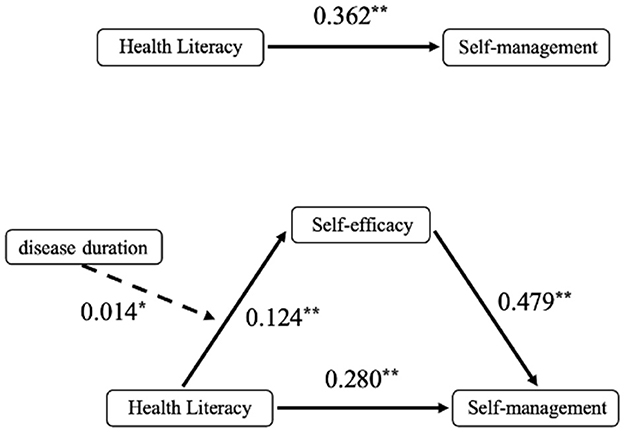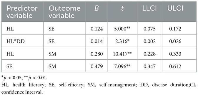 Discussion: These findings demonstrate that self-efficacy mediates the health literacy–self-management link, while disease duration enhances health literacy's effect on self-efficacy, supporting stage-specific precision interventions.