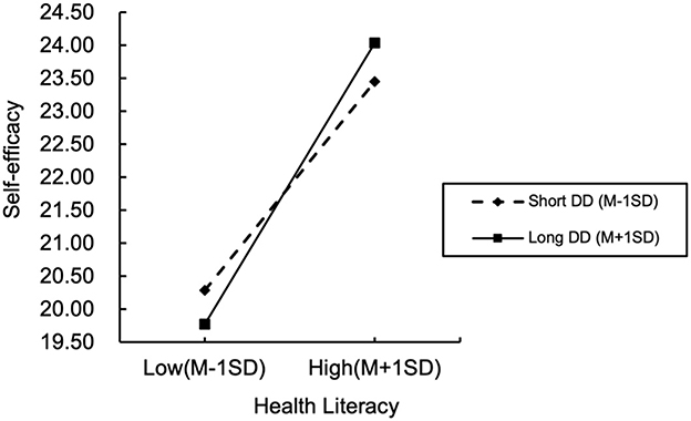 Figure 3. Moderating effects of disease duration on the relationship between health literacy and self-efficacy. DD, disease duration; SD, standard deviation.