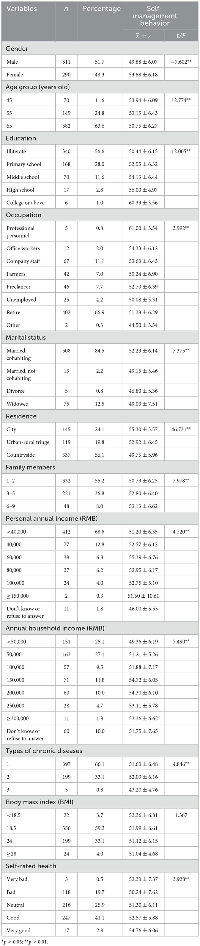 The study included 601 participants with the following demographic characteristics: a gender-balanced composition, 63.6% aged ≥65 years, 84.6% having primary education or below, and occupational profiles predominated by staff and retirees (78.0%). Most participants were married (86.7%), resided in rural areas (56.1%), and reported annual personal incomes ≤ ¥40,000 (68.6%). Regarding disease profiles, 66.1% had a single chronic condition, 37.1% exhibited overweight/obesity, and 43.9% self-rated their health status as “good.” Data analysis demonstrated statistically significant differences in self-management behavior scores across 11 variables including gender, age, and educational attainment (Table 1).