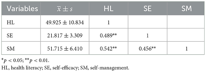 Correlation analysis revealed significant positive associations between health literacy and both self-efficacy (r = 0.489, p < 0.01) and self-management behaviors (r = 0.542, p < 0.01). Additionally, self-efficacy demonstrated a statistically significant positive correlation with self-management behaviors (r = 0.456, p < 0.01; Table 2).