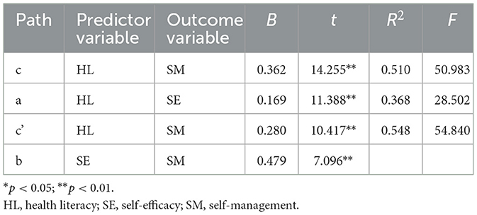 The mediating role of self-efficacy between health literacy and self-management behaviors was examined using Model 4 from Hayes' PROCESS macro. After adjusting for 11 covariates including gender, age, and educational attainment, regression analysis revealed a significant total effect of health literacy on self-management behaviors (Path c: B = 0.362, p < 0.01). The significant coefficient for Path a (B = 0.169, p < 0.01) indicated a strong association between health literacy and self-efficacy, while the significant Path b coefficient (B = 0.479, p < 0.01) confirmed the predictive relationship between self-efficacy and self-management behaviors (Table 3).