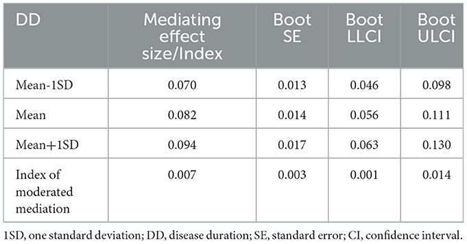 The study further calculated self-efficacy mediation effect sizes and their 95% Bootstrap confidence intervals using Mean ±1 standard deviation (SD) of disease duration as thresholds (Table 6). Results demonstrated that when disease duration was at −1 SD below the mean, the mediation effect of self-efficacy reached 0.070 [95% CI (0.046, 0.098)]. As disease duration increased to +1 SD above the mean, this mediating effect significantly intensified to 0.094 [95% CI (0.063, 0.130)]. Concurrently, the moderated mediation index yielded a statistically significant value [Index = 0.007, 95% CI (0.228, 0.333)] excluding zero, confirming the significance of the moderated mediation effect.