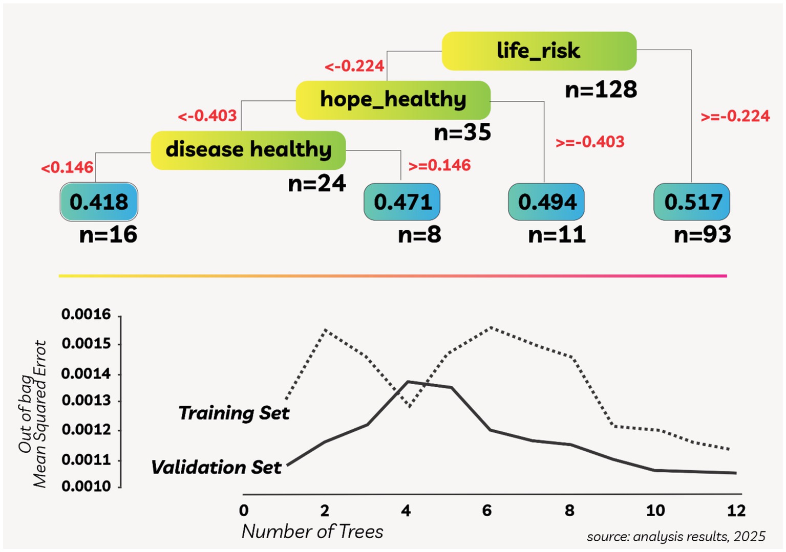 The RFR model (Table 1) shows more stable accuracy than DTR with MSE Validation = 6.041 × 10−4, Test MSE = 0.002, and OOB Error = 0.001. Both models consistently show that life risk decreases resilience, while hope healthy protects it. RFR additionally highlights the role of dynamic experience (MDI = 0.022), suggesting that field exposure strengthens resilience through adaptation and preparedness (28). High-risk exposure can have long-term impacts such as PTSD and metabolic disorders (17), while expectations of health accelerate recovery through post-traumatic growth (29). DTRs are more explicit in identifying key factors but prone to overfitting, while RFRs are more accurate and stable, although interpretation is more complex.