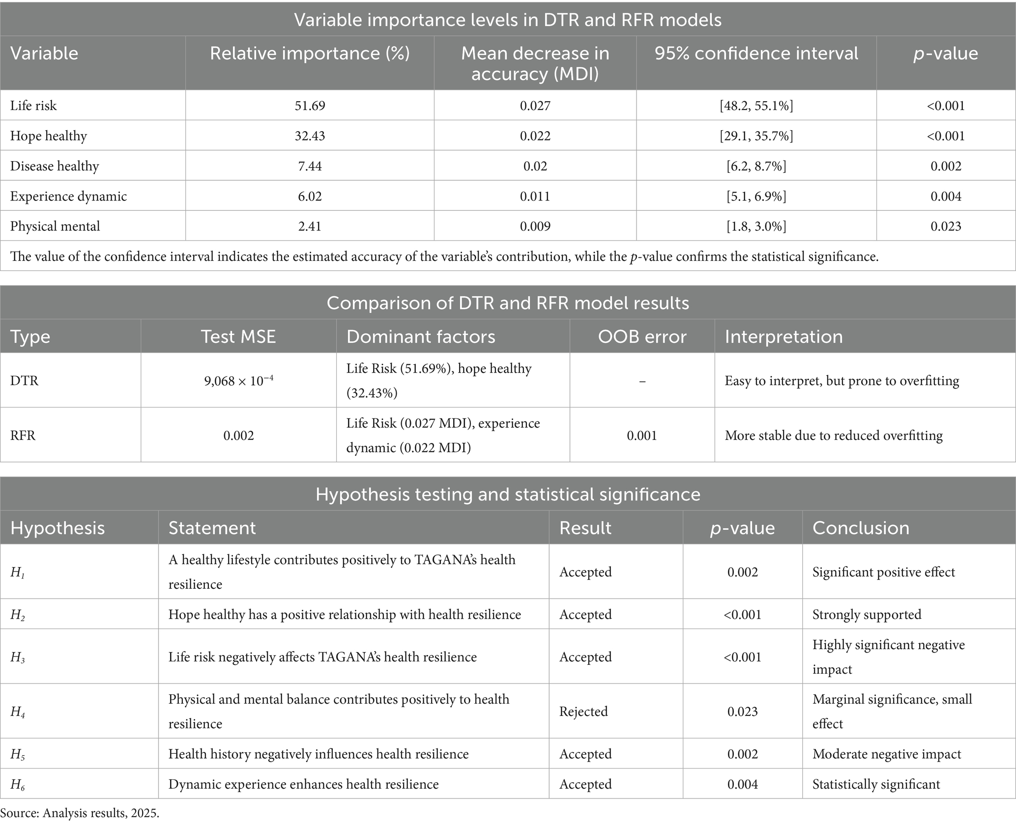 To strengthen statistical claims, 95% confidence intervals and effect sizes were calculated. H2 and H3 showed the strongest effects with narrow confidence intervals, H5 and H6 moderate but significant effects, while H4 remained marginal with a small effect size. This indicates that while central hypotheses are strongly supported, the nuanced role of balance requires cautious interpretation. Beyond statistical significance, variable importance rankings from RFR highlight life risk as the dominant factor decreasing resilience and hope healthy as a key protective factor. These findings suggest the need for occupational safety, psychosocial support, and training programs that strengthen optimism about future health. Other variables such as disease history and physical–mental balance, while less dominant, still indicate the relevance of preventive health education and routine health monitoring for long-term resilience. Taken together, the interpretability measures from RFR allow translation of statistical outputs into actionable health policy. To maximize evidence-based impact, disaster management agencies should focus on reducing life risks through occupational safety and psychological support, and enhance hope and health via training programs. Additionally, they should recognize the supportive role of physical–mental balance and disease prevention. In this study (Table 1), MDA was chosen as the main measure of variable importance because it is more reliable than Mean Decrease Impurity (MDI). DTR analysis confirmed life risk (51.69%) and hope healthy (32.43%) as the strongest predictors of resilience, while disease history (7.44%), dynamic experience (6.02%), and physical–mental balance (2.41%) contributed less. These results are reinforced by the international literature that confirms that life risks, including threats to physical and mental health, significantly affect long-term immunity (24). Meanwhile, hope healthy has been proven to be effective as a buffer for the negative impact of risk, improving quality of life and healthy behaviors (25, 26). Although the contribution of other factors is lower, a balance of physical activity is still important because excessive intensity can actually have a maladaptive impact (27).