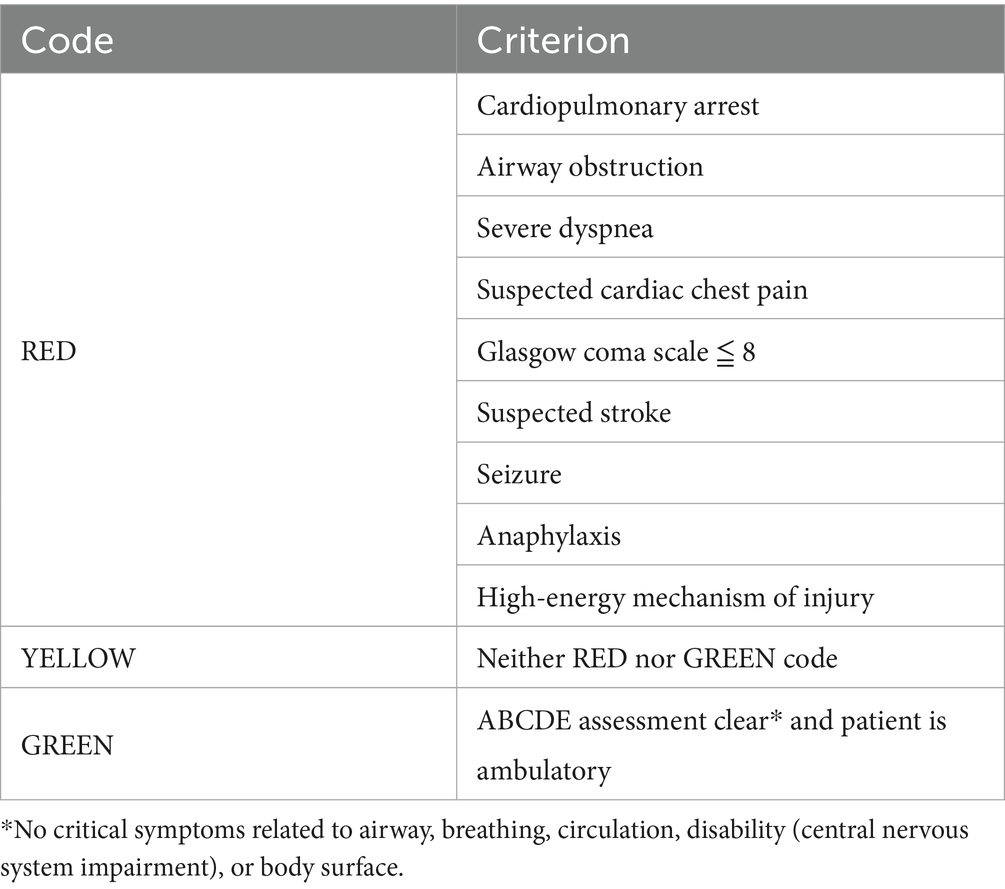 When a patient was identified, the KS was alerted by phone. A doctor or nurse was then dispatched from either the KS or a satellite area to triage the patient. Using a structured ABCDE approach based on symptoms and vital signs, the dispatched personnel assigned a code to the patient and reported it to the KS (Table 1). For the patients coded RED, a mobile medical unit (MMU), consisting of a doctor and nurse with resuscitation equipment and medications, was sent from the KS, while the nearest tertiary hospital was informed, and an ambulance was activated. For YELLOW-coded patients, the MMU was dispatched, but no ambulance was activated. GREEN-coded patients were escorted to the KS by the triaging personnel. All patients were treated at the KS until discharge or hospital transfer.