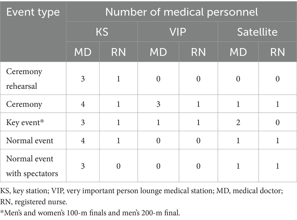 Throughout Tokyo 2020, the on-site medical system at the OLS comprised 38 doctors and 42 nurses (Supplementary Table S1). Most of the participating doctors specialized in Emergency Medicine, Internal Medicine, or Surgery, with 12 (31.6%), 11 (28.9%), and 7 (18.4%), respectively. The allocation of doctors and nurses in each designated medical area is detailed in Table 2. The VIP medical rooms were only operational during ceremony days and major events, resulting in a higher number of medical personnel on those days compared to regular days.