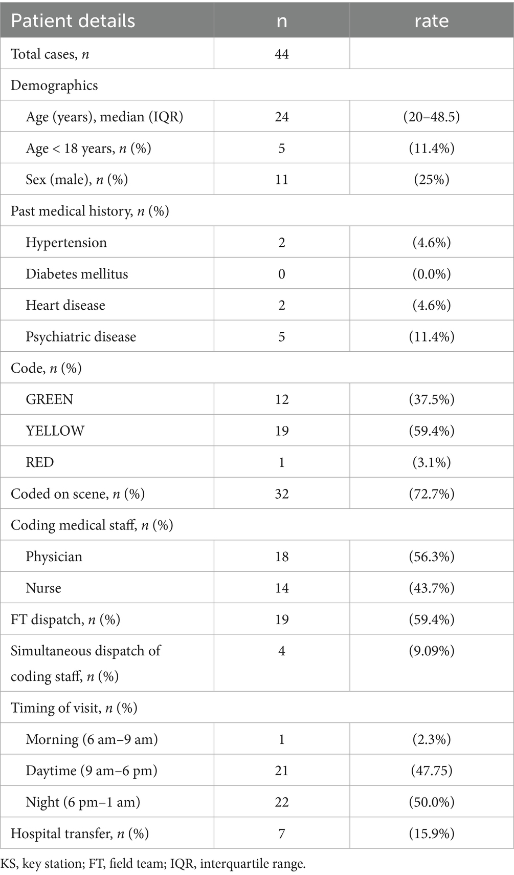 Table 3 outlines the patient characteristics at the OLS. The median age of the patients was 24 (20–49), and the majority were female [33 (75.0%)]. Most patients had no comorbidities. Of the 32 patients coded on-site, 18 (56.3%) were coded by a doctor. Only one patient (3.1%) received a RED code, while over half were coded YELLOW. Seven (15.9%) patients required hospital transfer (Table 3).