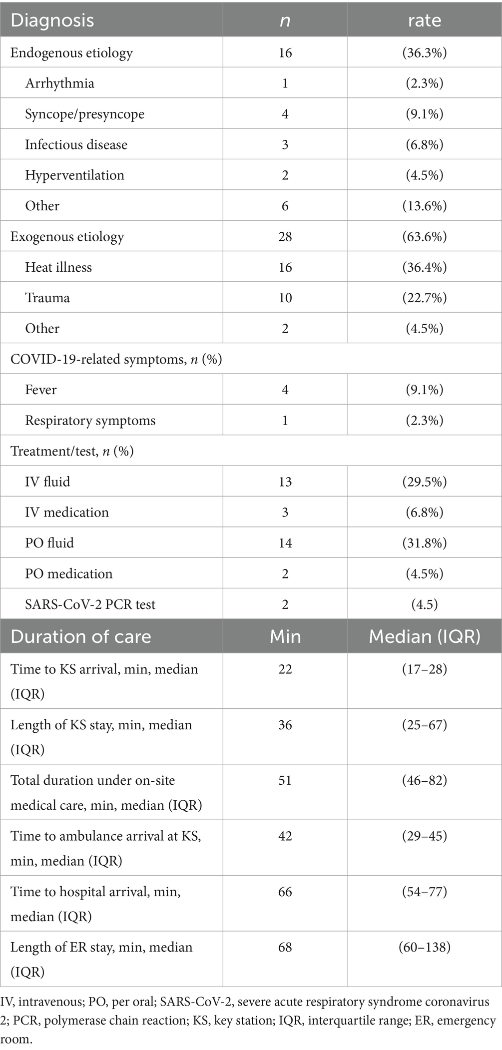 Table 4 presents the medical procedures, diagnoses, and timelines of all medical interactions. The most frequent diagnosis was heat illness, affecting 16 (36.4%) patients, while trauma was identified in 10 (22.7%) patients. Five patients exhibited COVID-19-related symptoms, with four (9.1%) having a fever and one (2.3%) presenting respiratory symptoms without fever. The median times for arrival at the KS, duration of on-site medical care, and total prehospital time were 22 (17–28), 51 (46–82), and 66 (54–77) min, respectively.