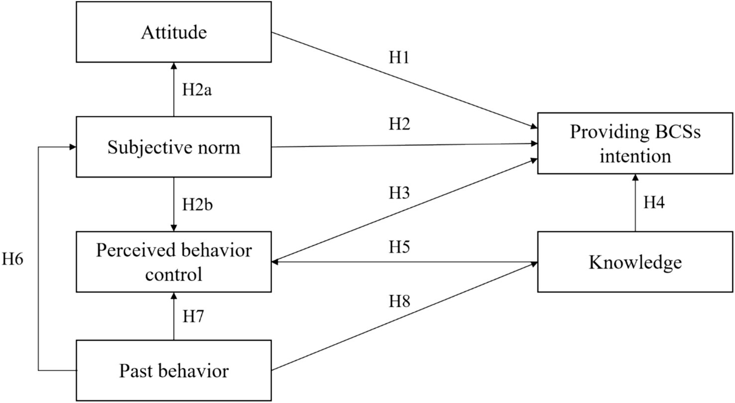 The predictive utility of the TPB has been shown to improve when additional variables are integrated into the model (38, 39). Additionally, past behavior (PB) and knowledge have been incorporated into the TPB model in health-related studies, supporting their inclusion as variables to enhance the predictive power of TPB (40–42). Among primary care physicians, knowledge of BCS may indirectly influence their behavioral intentions through PBC and attitude. Greater knowledge enhances awareness of the benefits of screening, fostering a more positive attitude toward its provision. Moreover, prior experience with screening helps physicians build procedural familiarity, improving their perceived competence and reducing the perceived difficulty of the task. Such experience may also increase understanding among significant others, thereby enhancing the social support physicians receive when delivering screening services. Consequently, we propose the following hypotheses: