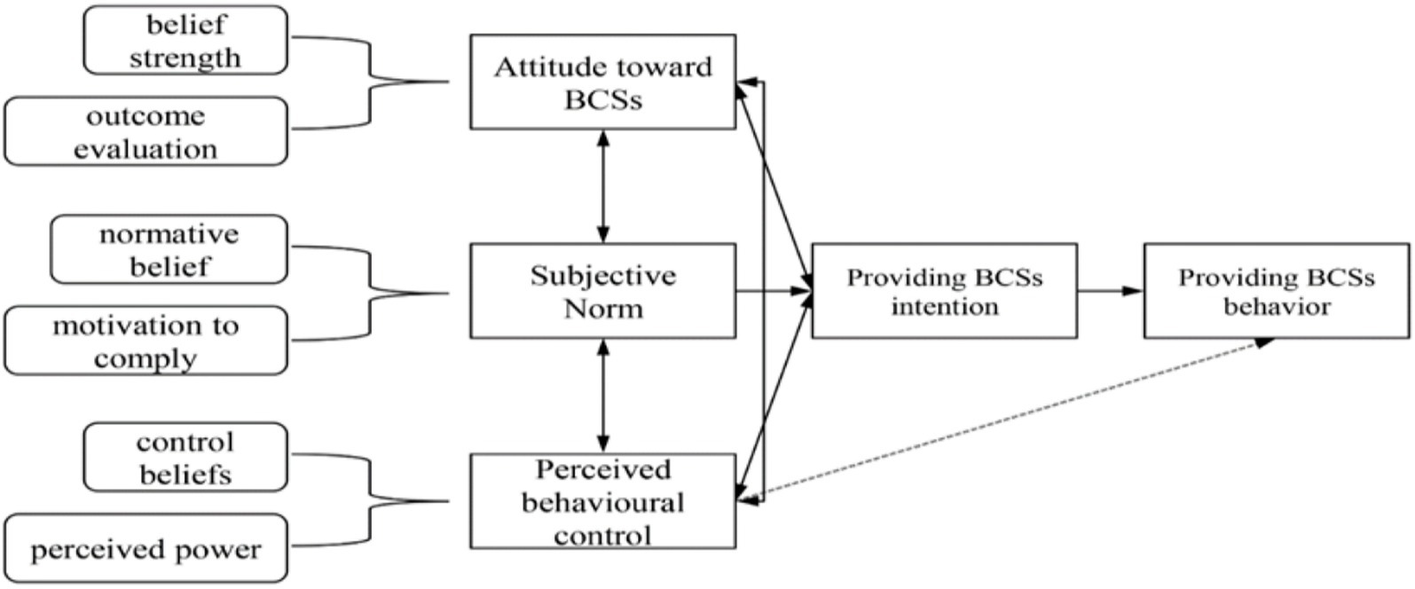 In this study, attitude refers to primary care physician’ evaluation of providing BCSs. According to the TPB, A is an important factor that influences an individual’ s intentions and subsequent behavior. Physicians’ intention to provide BCSs is likely to increase if they perceive it as fulfilling personal values, achieving a sense of accomplishment, or recognizing the critical importance of BCS. For instance, Allenbaugh et al. (33) indicated positive attitudes among nurses and residents toward their interactions can significantly enhance the quality of care. Based on this, we propose the following hypothesis: