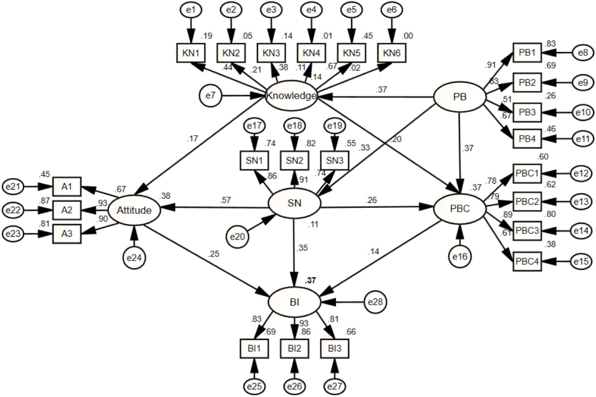 Figure 3. The results of SEM analysis. BI, behavior intention; SN, subjective norm; PBC, perceived behavior control; PB, past behavior.