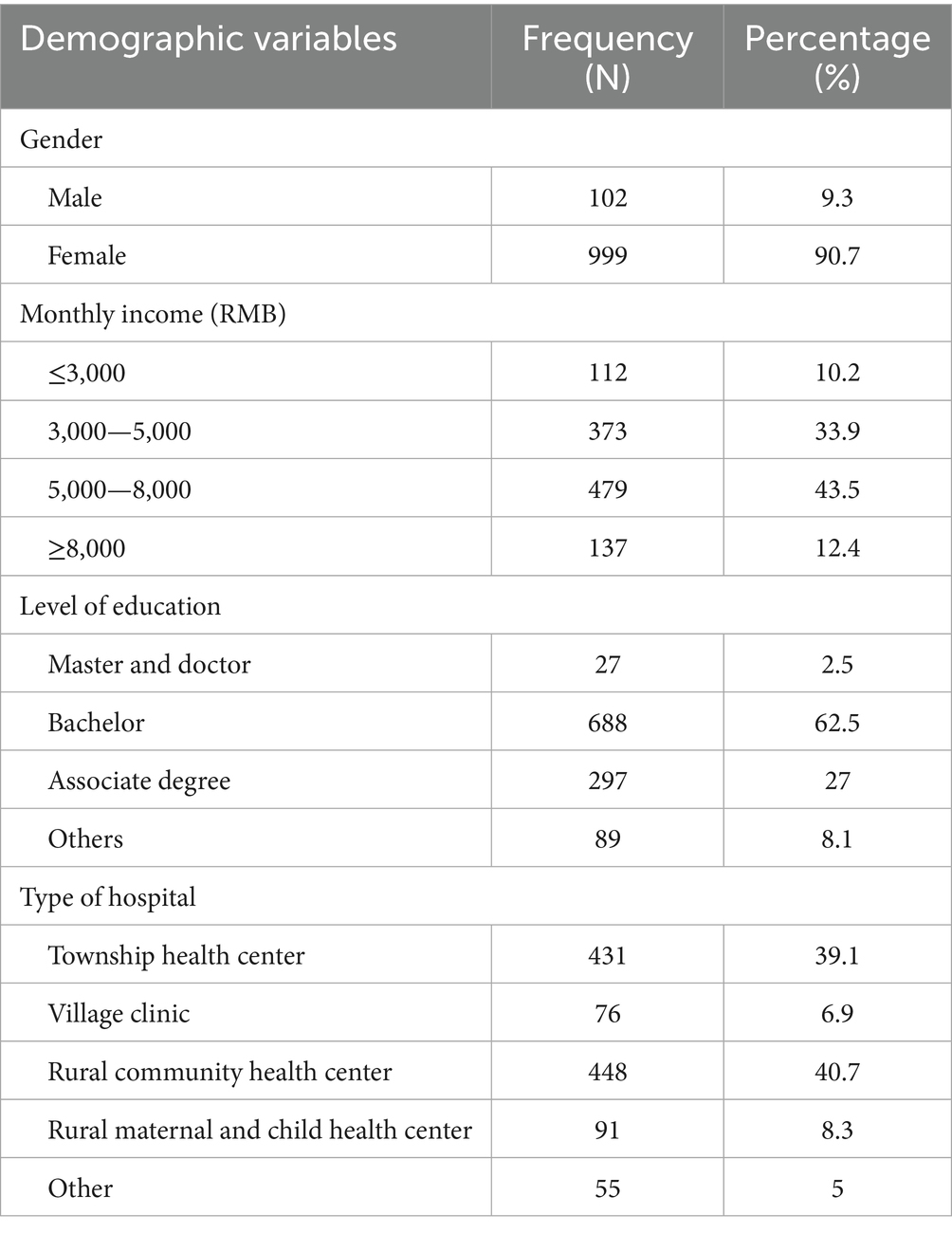 A total of 1,205 questionnaires were distributed, and 1,101 valid responses were collected, resulting in a valid response rate of 91.37%. Questionnaires with extreme data were excluded. According to the recommendation by Bagozzi and Yi (43), the sample size meets the requirements for subsequent structural equation modeling analysis. The sample composition is shown in Table 1. The majority of respondents were female (90.7%), whereas only 9.3% were men. Most primary healthcare providers reported relatively low-income levels, with only 12.4% earning more than 8,000 RMB per month. In terms of educational attainment, the majority (62.5%) held a bachelor’s degree. A substantial proportion (79.8%) were employed at community health service centers or township health centers.
