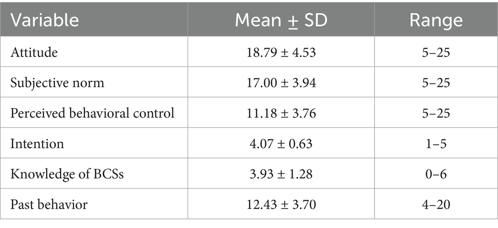 The results of the descriptive analysis were presented in Table 2. Primary care physicians in this study demonstrated a generally favorable attitude toward providing BCSs to rural women, the average mean score of variable attitude was 18.79 ± 4.53 (range: 5–25). However, participants reported limited support from colleagues, patients, and leaders during their daily practice of BCSs (mean = 17.00, SD = 3.94, score ranging from 5 to 25). Moreover, their PBC over engaging in BCSs was relatively low (mean = 11.18, SD = 3.76, score ranging from 5 to 25). Despite these challenges, the study revealed that primary care physicians exhibited a relatively high intention to provide BCSs for rural women (mean = 4.07, SD = 0.63, score ranging from 1 to 5) and demonstrated a good knowledge level of BCSs, with a mean score of 3.93 ± 1.28 (range: 0–6). However, their experience in providing BCSs for rural women was relatively limited, with a mean score of 12.43 ± 3.70 (range: 4–20).