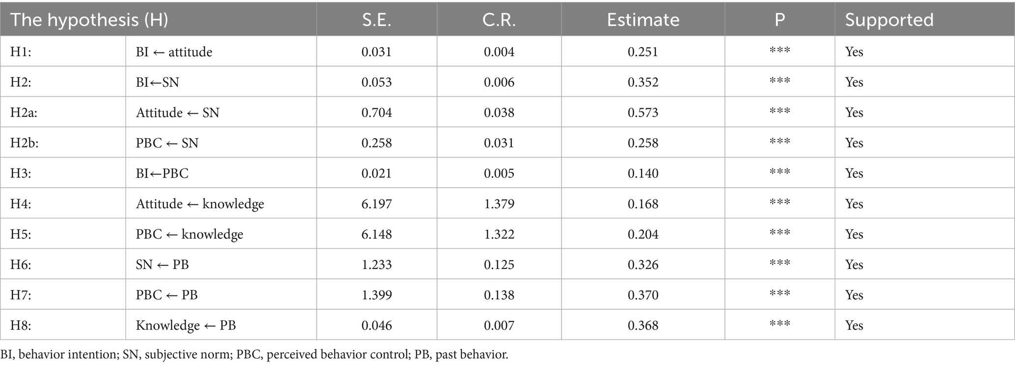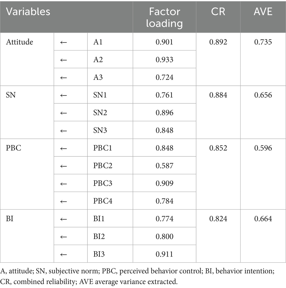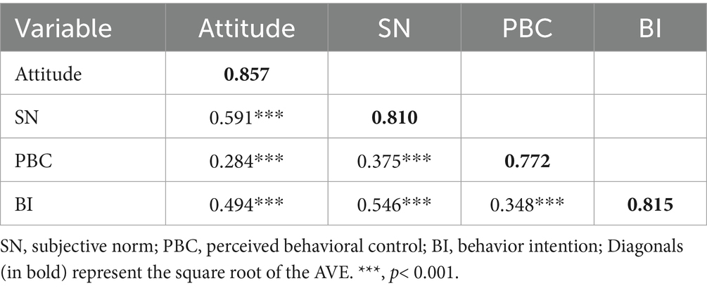 Confirmatory factor analysis (CFA) was conducted on the remaining half of the data (n = 551) using AMOS 23.0 to assess structural, convergent, and discriminant validity. The maximum likelihood method was applied to assess the model fit. The results indicated that the χ2/df ratio was 2.211 (<5), RMSEA (root mean square error of approximation) was 0.047 (<0.050), and SRMR (standardized root mean square residual) was 0.034 (<0.08). Additionally, CFI (comparative fit index), TLI (Tucker-Lewis index), and NFI (normed fit index) values all exceeded 0.90, demonstrating strong structural validity and a satisfactory model fit (45). As shown in Table 3, the standardized path coefficients for the four latent variables were all above 0.5. The average variance extracted (AVE) for each latent variable exceeded 0.5 (46), and the combined reliability surpassed 0.7 (47), indicating that the convergent validity is acceptable. Discriminant validity was assessed using the Fornell-Larcker criterion (46, 48). As shown in Table 4, Attitude, SN, PBC, and BI were significantly correlated (p < 0.001), yet the correlations between constructs were all lower than the square root of their respective AVEs, indicating adequate discriminant validity. This finding indicates that the variables were closely interrelated yet distinct from one another. Therefore, the scale demonstrated satisfactory discriminant validity (49).