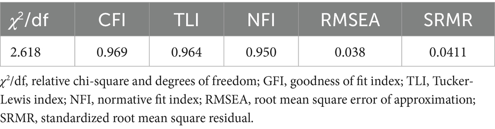 SPSS 23.0 was employed to perform exploratory factor analysis on the collected data to verify the validity and reliability of the questionnaire. We conducted both exploratory factor analysis (EFA) and confirmatory factor analysis (CFA). The sample was randomly divided into two groups, and half of the original data (N = 550) was used to perform the EFA. Factor analysis was first conducted. The Kaiser-Meyer-Olkin (KMO) value was 0.848 > 0.5, the approximate chi-square value of Bartlett’s test of sphericity was 4438.024, and the significance probability was less than 0.001. These results indicate that the data were highly suitable for factor analysis (44). Principal component analysis was applied to extract common factors, and the maximum variance orthogonal rotation method was employed for data analysis. Four common factors with characteristic root exceeding 1 were extracted, with a cumulative contribution rate of 77%. The factor loadings of individual items ranged from 0.752 to 0.867. Cronbach’s alpha coefficients for all four dimensions were above 0.8, indicating high internal reliability.