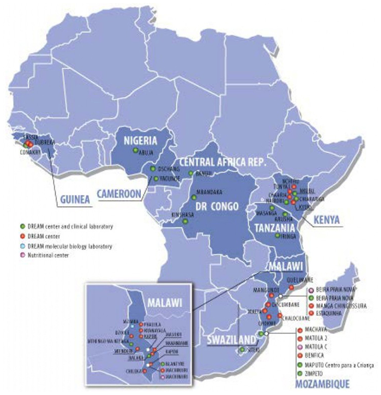 The DREAM Program is currently implemented in 10 countries in Sub Saharan Africa (Figure 1): Malawi, Mozambique, Tanzania, Guinea, Democratic Republic of Congo, Cameroon, Eswatini, Kenya, Central African Republic, and Nigeria. It offers a wide range of services: HIV diagnosis and treatment, prevention of mother to child transmission of HIV, tuberculosis diagnosis and treatment, hypertension screening and treatment, nutritional interventions, screening and treatment of epilepsy and other neurological conditions, screening and treatment of precancerous lesions of the cervix, vaccinations; its 50 outpatient clinics and 28 molecular biology laboratories are integrated into national programs to fight HIV and tuberculosis, working in collaboration with the Ministries of Health of the respective countries. The above mentioned facilities offer free-of-charge treatment and care directly to more than 90,000 people living with HIV and 20,000 patients suffering from other chronic conditions, and indirectly contribute to the care of other 400,000 PLWH through laboratory services.