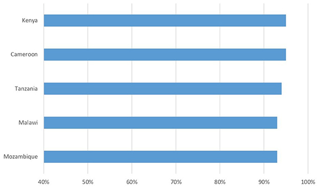 Retention in care once treatment has started is an important goal in a chronic disease like HIV, whose therapy is lifelong; people with HIV need to be motivated and supported in the face of normal “therapeutic fatigue,” especially when, as periodically happens, fake news of miraculous healings spread. Figure 2 shows data from a cohort of 65,191 patients followed in DREAM centers in five countries at the end of 2022, and the percentage of them being still in the treatment center at the end of 2023. All patients in care on December 31th 2022 in the five countries were included, they represent the 74% of the 88,257 patients in care in the 10 countries. A patient was considered in treatment in the center if he/she had not an outcome of “death,” “transfer out” or “lost,” this last outcome refers to patients missing a scheduled drug refill appointment for more than 3 months. Retention rates vary from 93 to 95%.