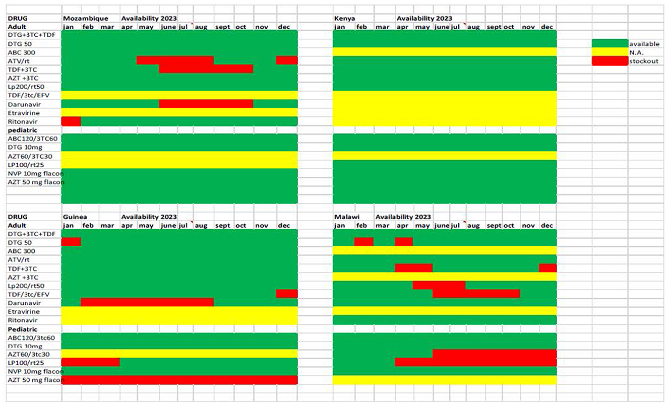 Figure 4. Availability of ARV drugs in pharmacies of DREAM Centers in four countries during calendar year 2023.