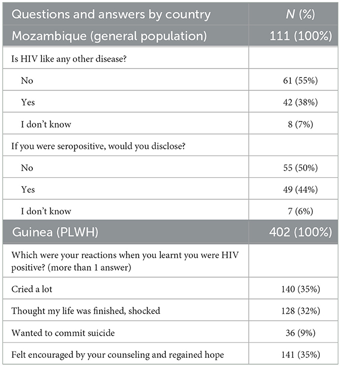 A further challenge is certainly that of combating and overcoming stigma and in some cases discrimination. Although the life of people with HIV in the vast majority of cases is now an absolutely “normal” life, for many HIV is not a disease like any other. It is in fact a condition that involves many aspects of life, not only physical health but also family relationships and social life. Table 1 shows the results of two surveys, one conducted in Mozambique on HIV-negative people, the other in Guinea on 400 people with HIV, DREAM patients. More than half of the interviewees think that HIV is not a disease like any other, and would not tell anyone that they are HIV positive. When asked “what were your reactions when you found out you had HIV,” 32% had reactions of strong despair, shock, and 9% thought about suicide. But we also see that 35% of the people felt encouraged by the advice and support of the staff and regained hope in living. These data support the practice that has been consolidated over many years of always accompanying the HIV test with a moment of counseling, of dedicating time to this diagnosis that has such an impact on people's lives.