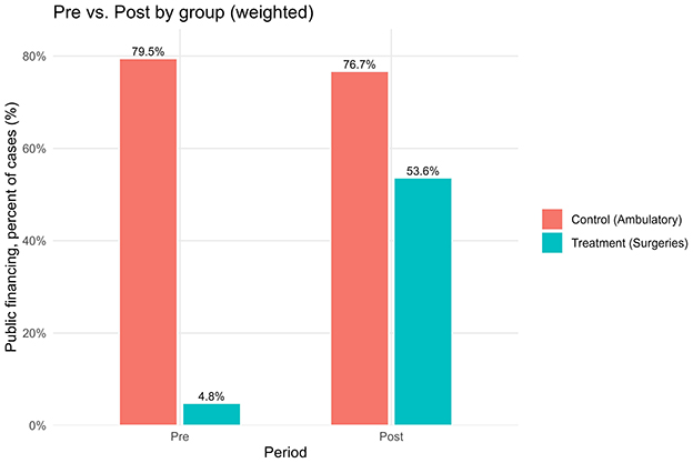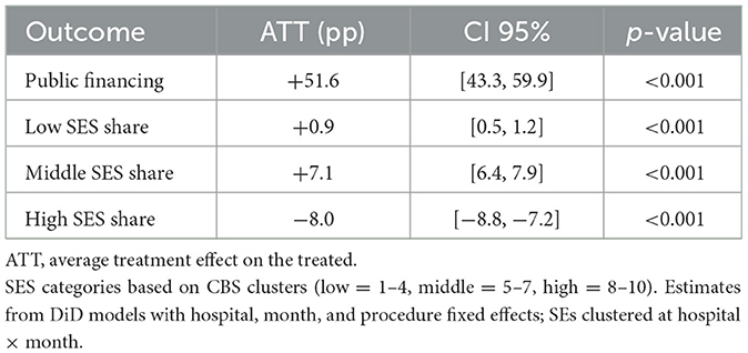 Results: Publicly financed surgeries increased from 5% to 51% (ATT +51.6pp; 95% CI 43.3-59.9; p < 0.001), while supplementary and private financing declined. The share of middle-SES patients rose from 52% to 57% (+7.1pp), high-SES declined from 35% to 29% (−8.0pp), and low-SES increased modestly from 13% to 14% (+0.9pp). In contrast, the control group showed only minimal changes.