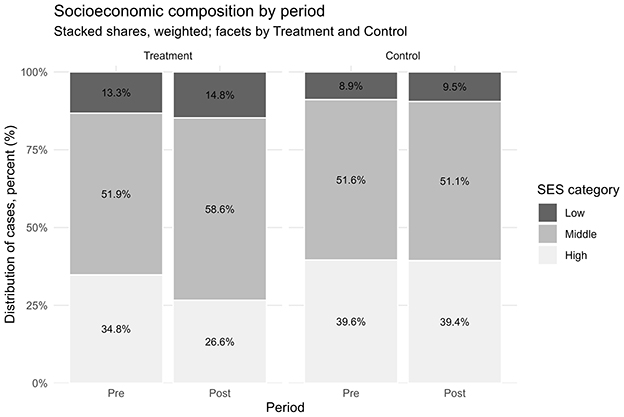 Figure 2. Socioeconomic composition of patients (low/middle/high), pre- vs. post-reform; faceted by treatment and control; stacked percentages with labels.