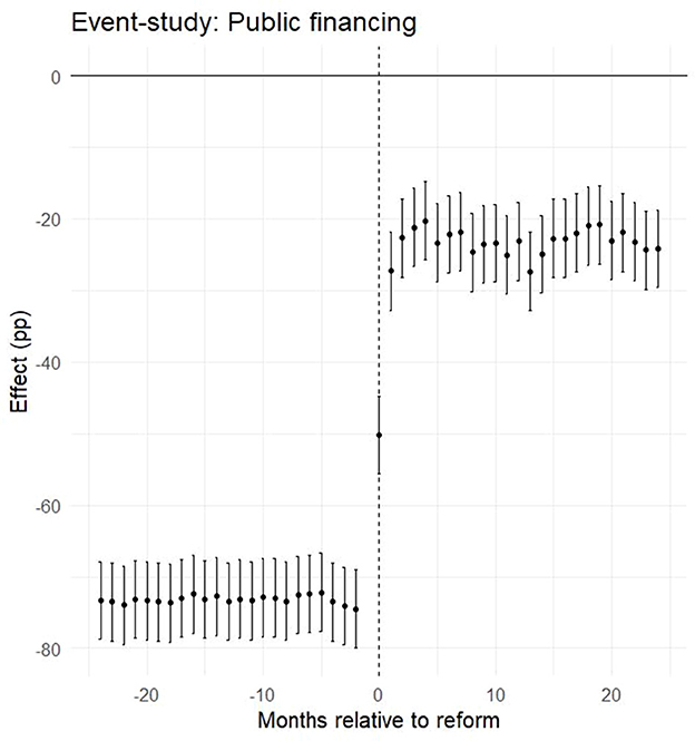 Figure 3. Event-study estimates for public financing (pp): coefficients relative to reform month (k = 0) with 95% CIs; parallel pre-trends and discrete post-reform level shift.