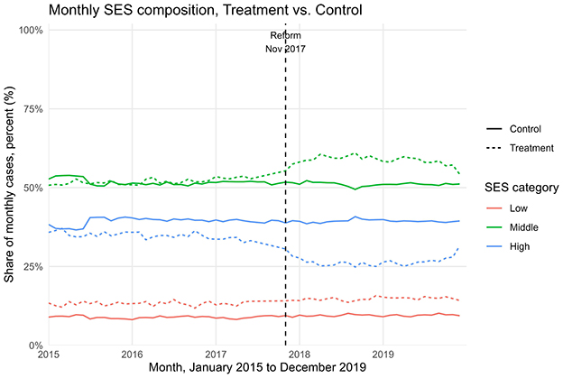 Figure 4. Monthly SES composition (% low/middle/high) over time, treatment (dashed) vs. control (solid); vertical line marks reform month (November 2017).