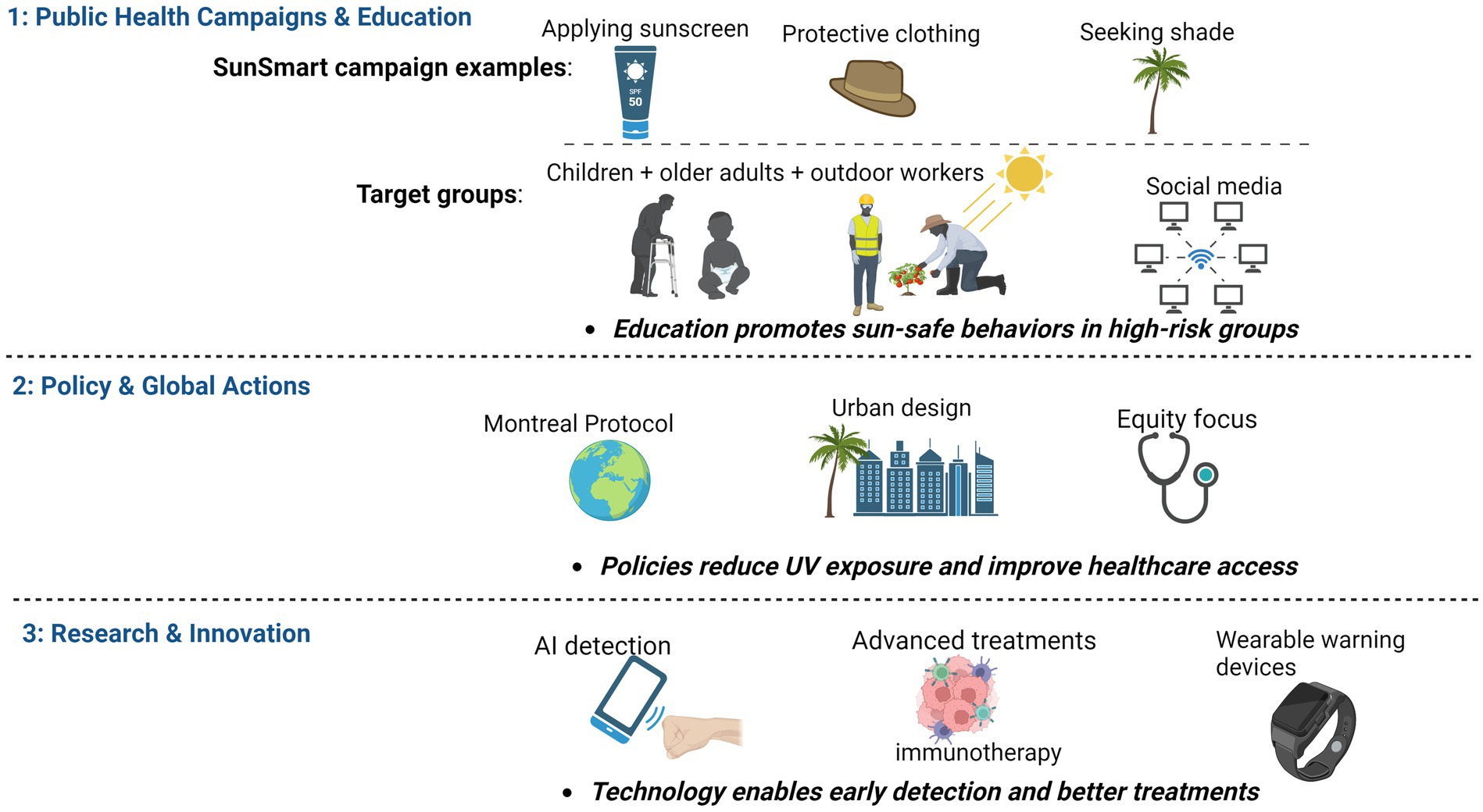 Public health experts and policymakers must address climate change’s contribution to rising skin cancer incidence. While large-scale environmental changes require systemic action, effective strategies exist to mitigate risk, promote prevention, and improve outcomes. Key approaches include public health campaigns, international policy actions, and research innovations in detection and treatment.